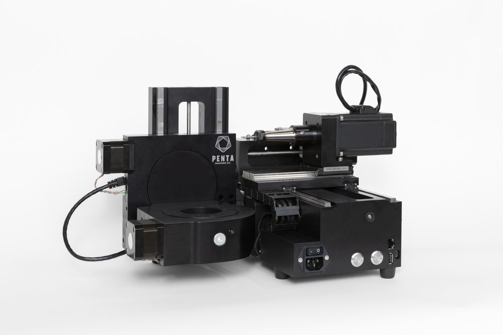 卓上サイズで本格的な5軸加工が可能なPocketNC(ポケットNC)。 AC100Vで稼働し、自身のPCでコントロールができる。教育機関や試作品の内製化に最適な製品。