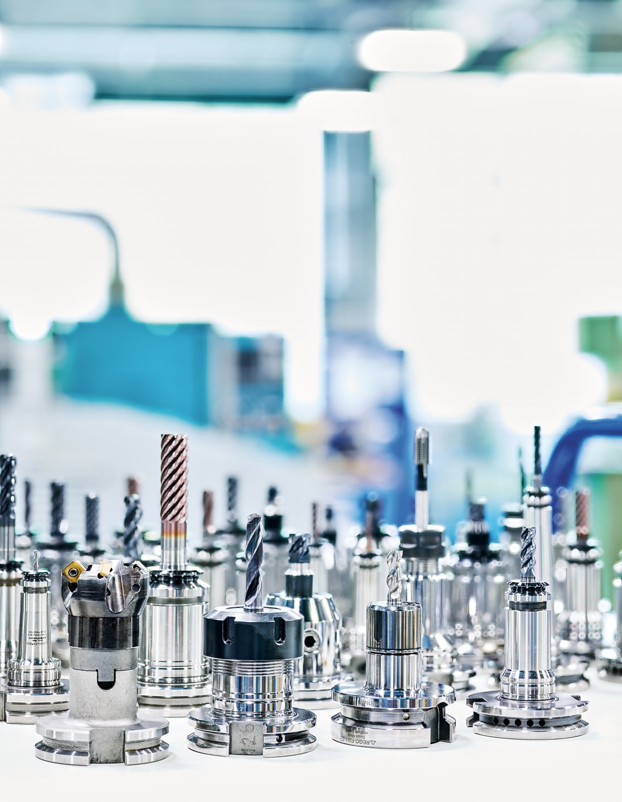 HELITRONIC G200は、WALTER社の高精度加工技術を搭載し、フロアスペース2.3m2を実現しました。機内に最大500本まで搭載可能なトップローダーも設置し、自動加工も可能です。