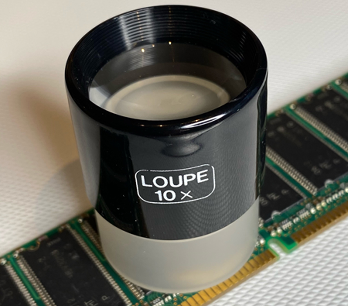 直置きで焦点が合う10倍ルーペの採光部に静電気拡散性の樹脂を採用した製品です。静電気に敏感なデバイスに直接触れても安心な設計です。