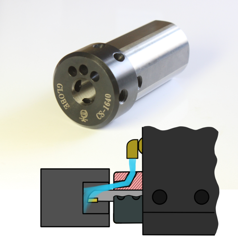 CNC旋盤用新型ボーリングバースリーブです。 クーラントがかかりにくい内径旋削加工の問題をボーリングバースリーブで解決。クーラントをボーリングバーに沿わせて刃先まで大量噴射