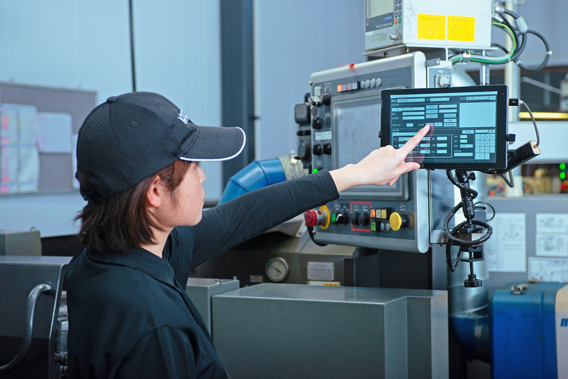 全ての設備にタブレットを設置し個別原価/品質/生産状況など現在の状況を瞬時に確認できるシステムを活用している。