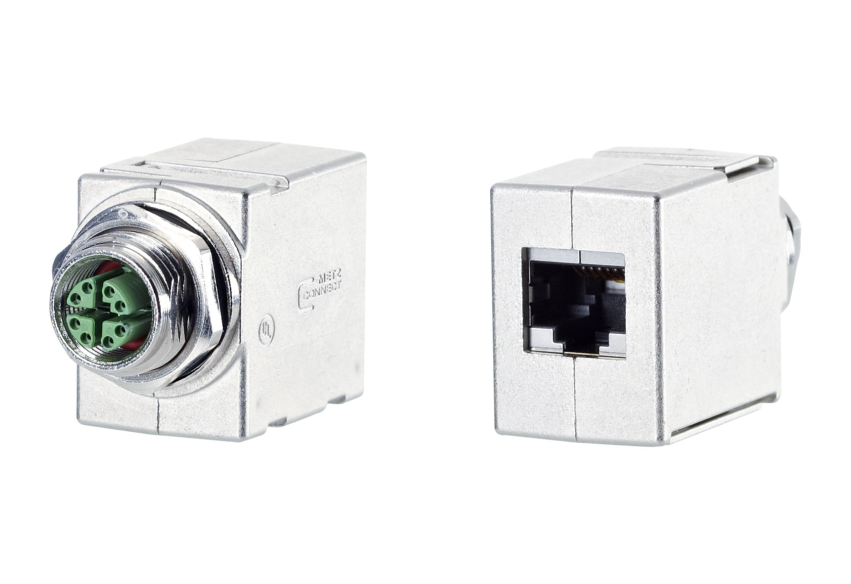 M12(D,X)ーRJ45変換アダプター、ネジでしっかり固定し、M12側はIP67を確保。制御盤の外壁に使用することで内部配線が容易になる優れもの。