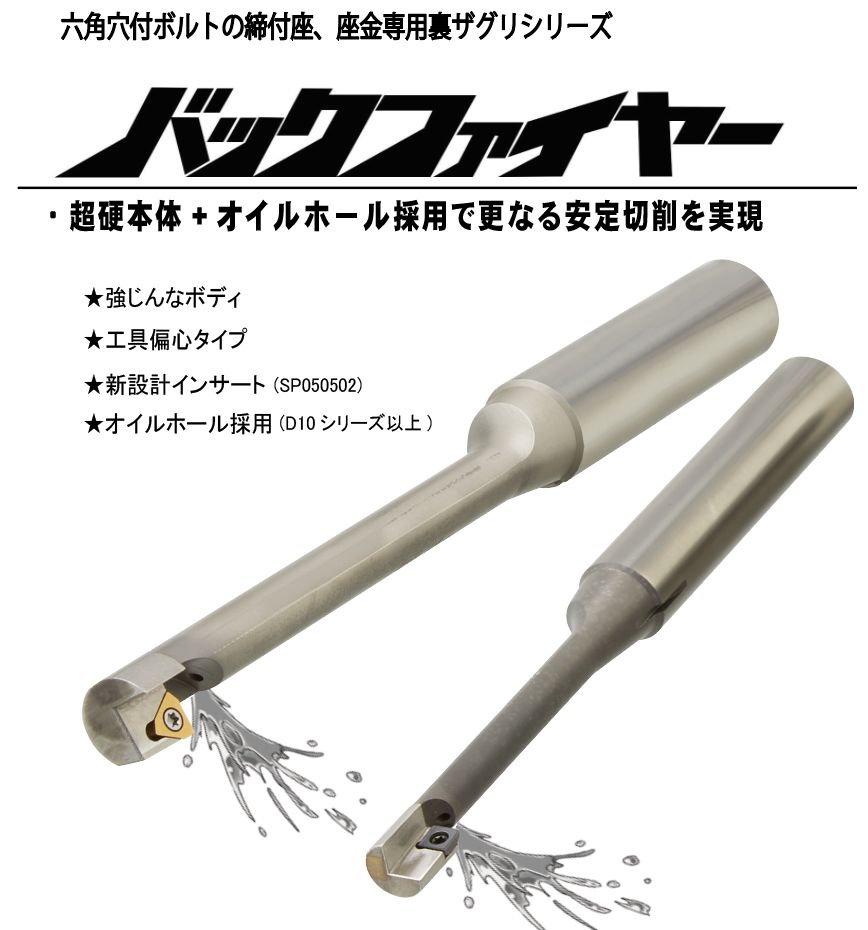 バックファイヤー ・超硬本体+オイルホール採用で更なる安定切削を実現 ★強じんなボディ ★工具偏心タイプ ★新設計インサート(SP050502) ★オイルホール採用(D10以上)
