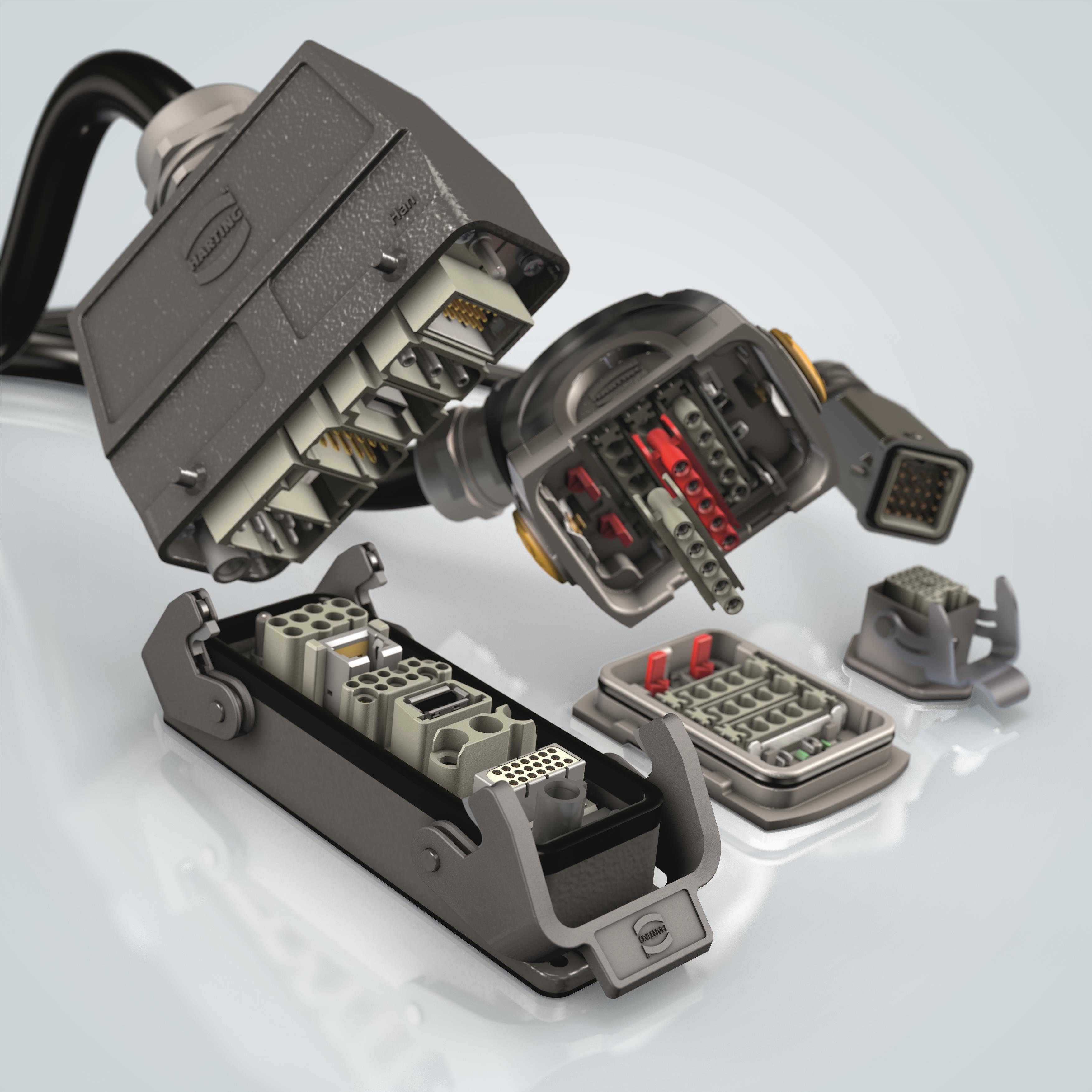 ハーティングが業界標準を確立した角型産業用コネクタHan。高い防塵・防水性 を備え、モジュール単位で信号、電力、光、エアーなどを自由に組み合わせて接続 の集約が可能。