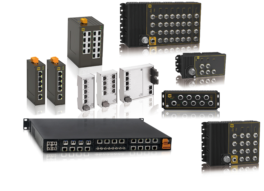 アンマネージド、マネージドの幅広い品ぞろえ。ギガビット伝送対応。RJ45イ ンターフェース製品の他、鉄道規格に準拠したM12接続の防水型スイッチもライ ンアップ