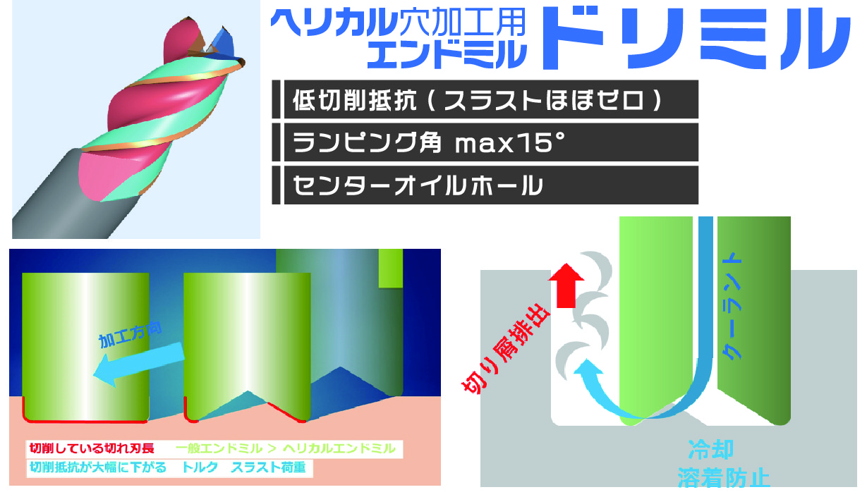 NEW ヘリカル穴加工用エンドミル【ドリミル】 / End mill specialized for helical milling [Drimill]