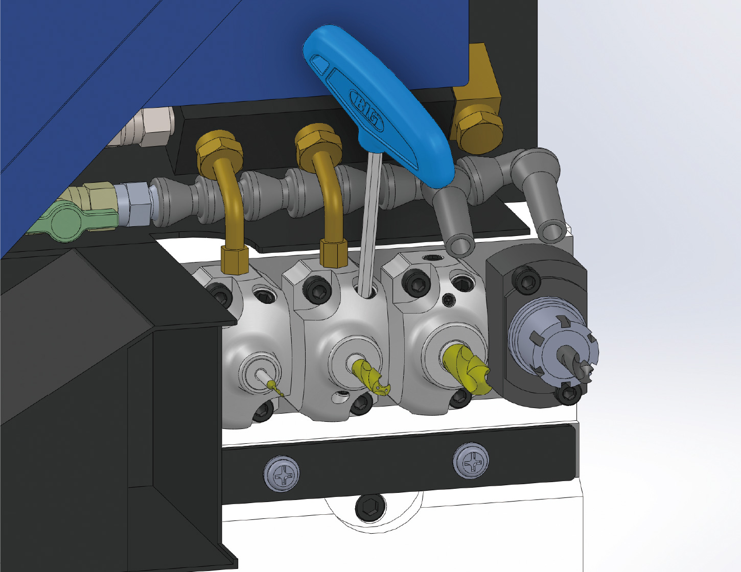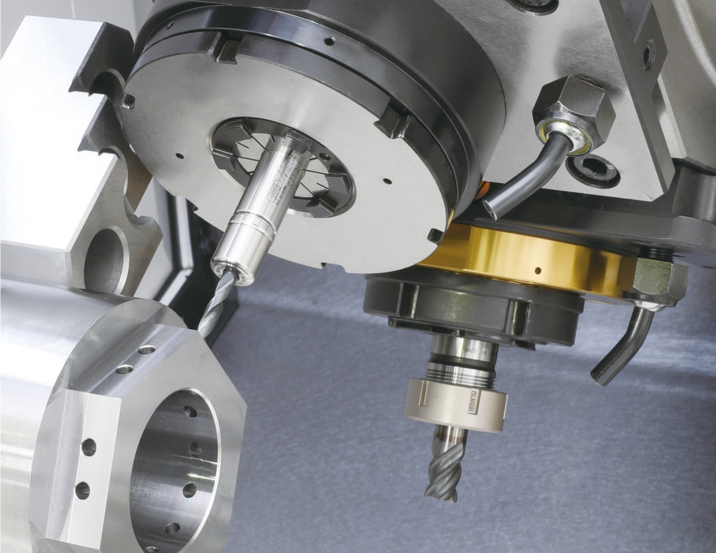高精度で好評を得ているハイドロチャックは、マシニングセンタ用に加えて、今回CNC自動旋盤用シリーズを拡充。隣接工具やクーラント配管を回避し、レンチ1本で工具の着脱が可能。