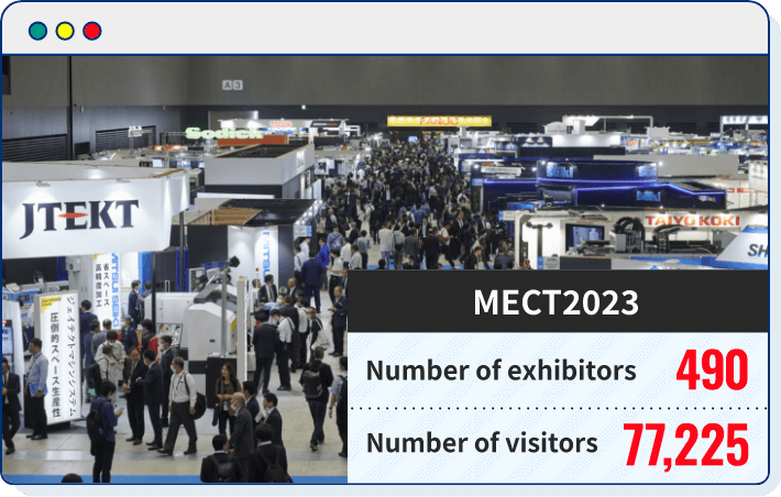 MECT is the machine tool show started in 1987. It is held in autumn every two years at Port Messe Nagoya in Nagoya city and is the biggest machine tool show in odd-numbered years. MECT2023 attracted 490 companies and organizations occupying 2,101 booths and 77,225 visitors attended.It will be the 20th time in 2025.