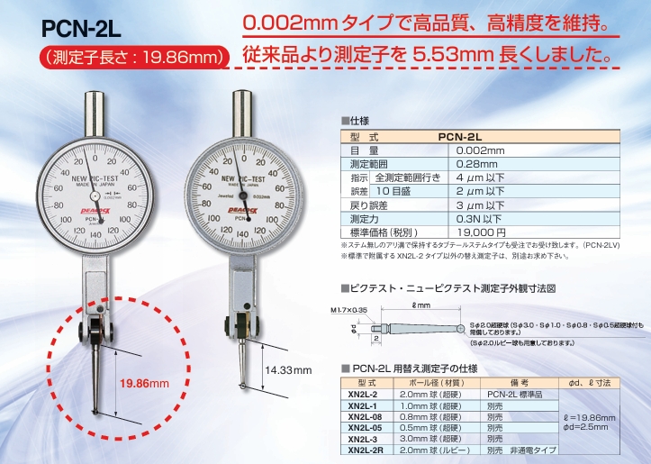 ニューピクテストPCN-2L型は目量0.002mmで高品質、高精度を維持したまま従来品より測定子の長さが5.53mm長くなり、利便性に長けてご使用頂ける製品です。