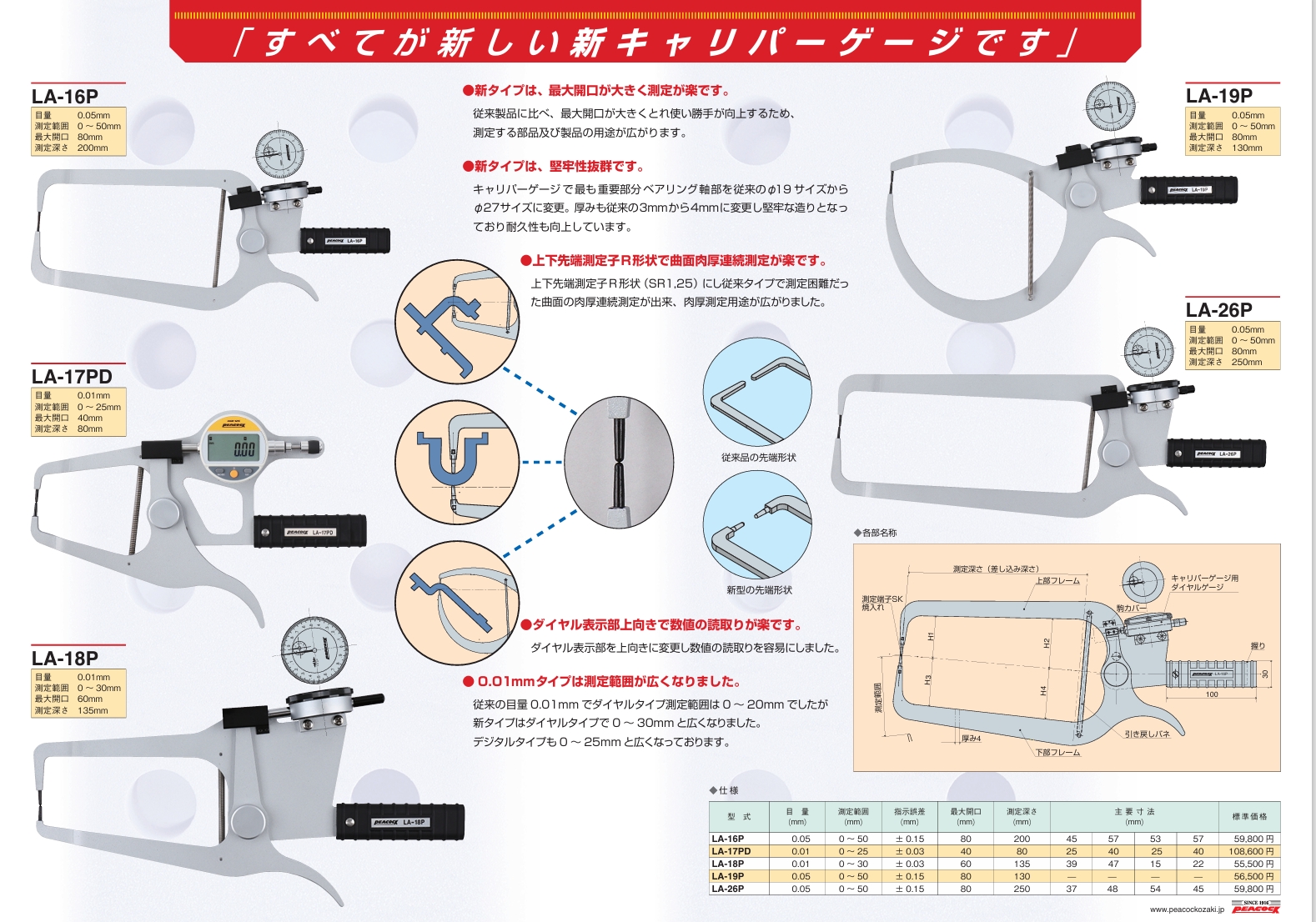 新タイプは従来品に比べ最大開口が大きく使い勝手が向上し測定する部品及び製品の用途が広がります。上下先端測定子R形状にて従来品では困難だった曲面の肉厚連続測定も可能です。