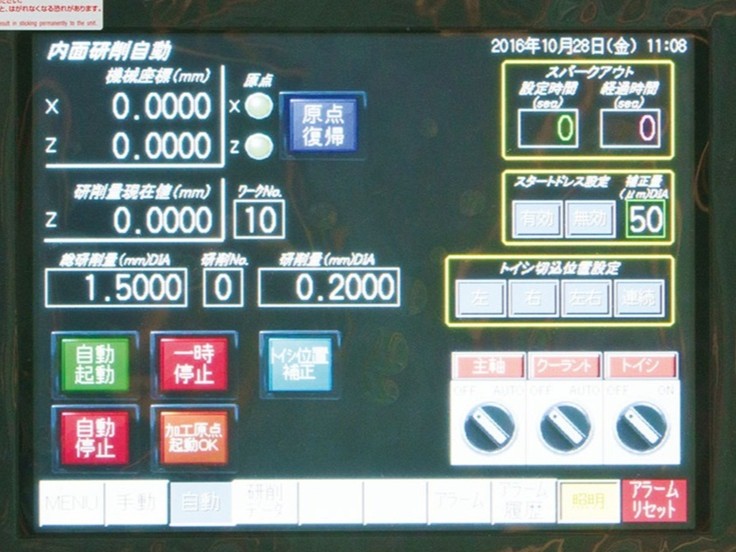 更にこの度タッチパネルのサイズアップにより画面の視認性が高まり、タッチパネル内ボタンと物理ボタンの再配置を行ったことで、より直感的に操作でき作業性が向上しました。手動ハンドルも機構を見直し、繊細な作業を実現します。熟練の技術者にはもちろん、研削盤が初めての作業者の方にもお薦めしたい精密内面研削盤です。