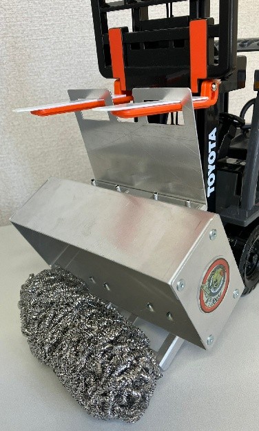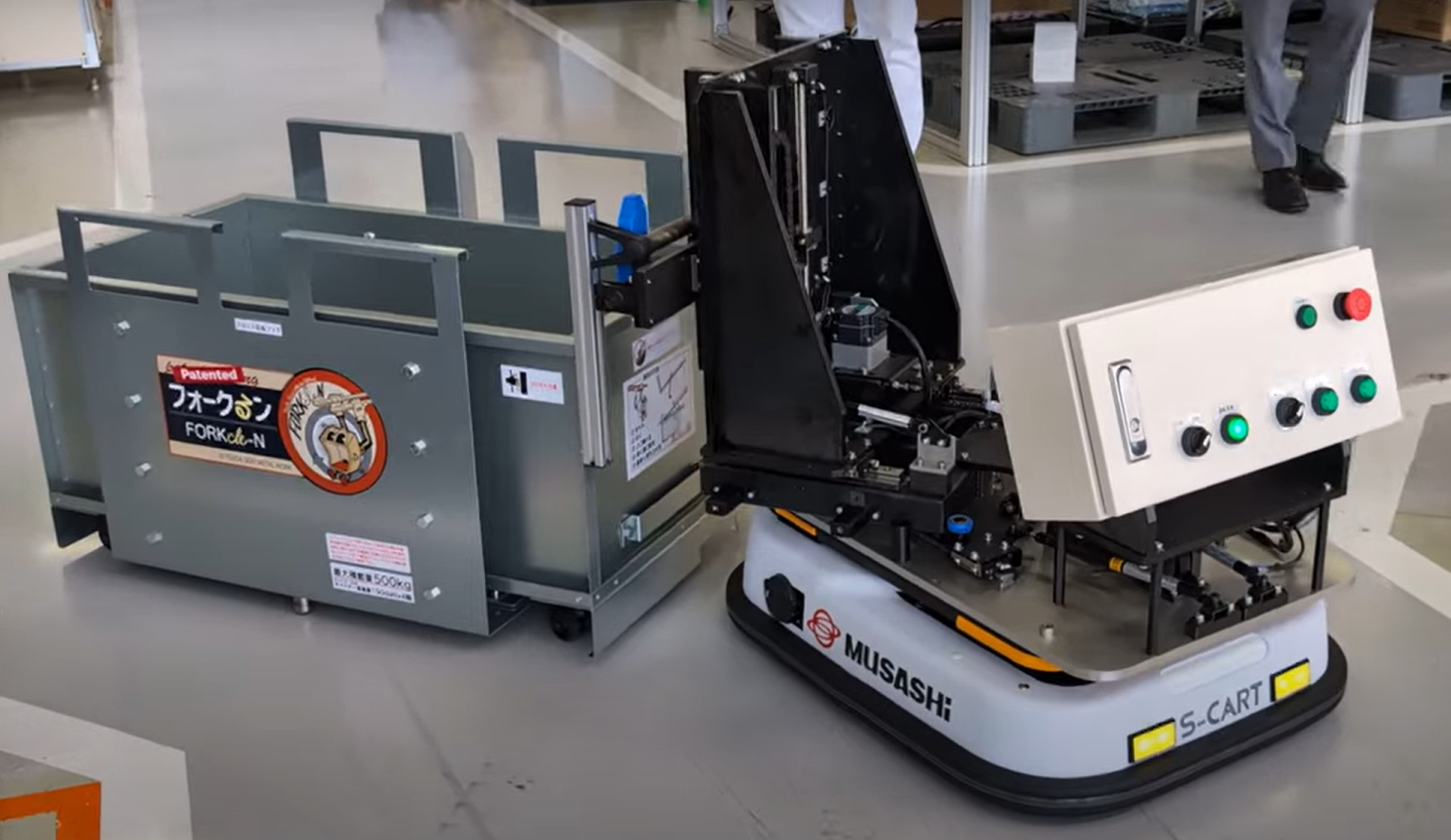 今回の展示には津田工業製のフォークるンという切粉台車をAGVが運びます。フォークるン自体はフォークリフトに乗ったまま運搬、廃棄出来る優れものです。