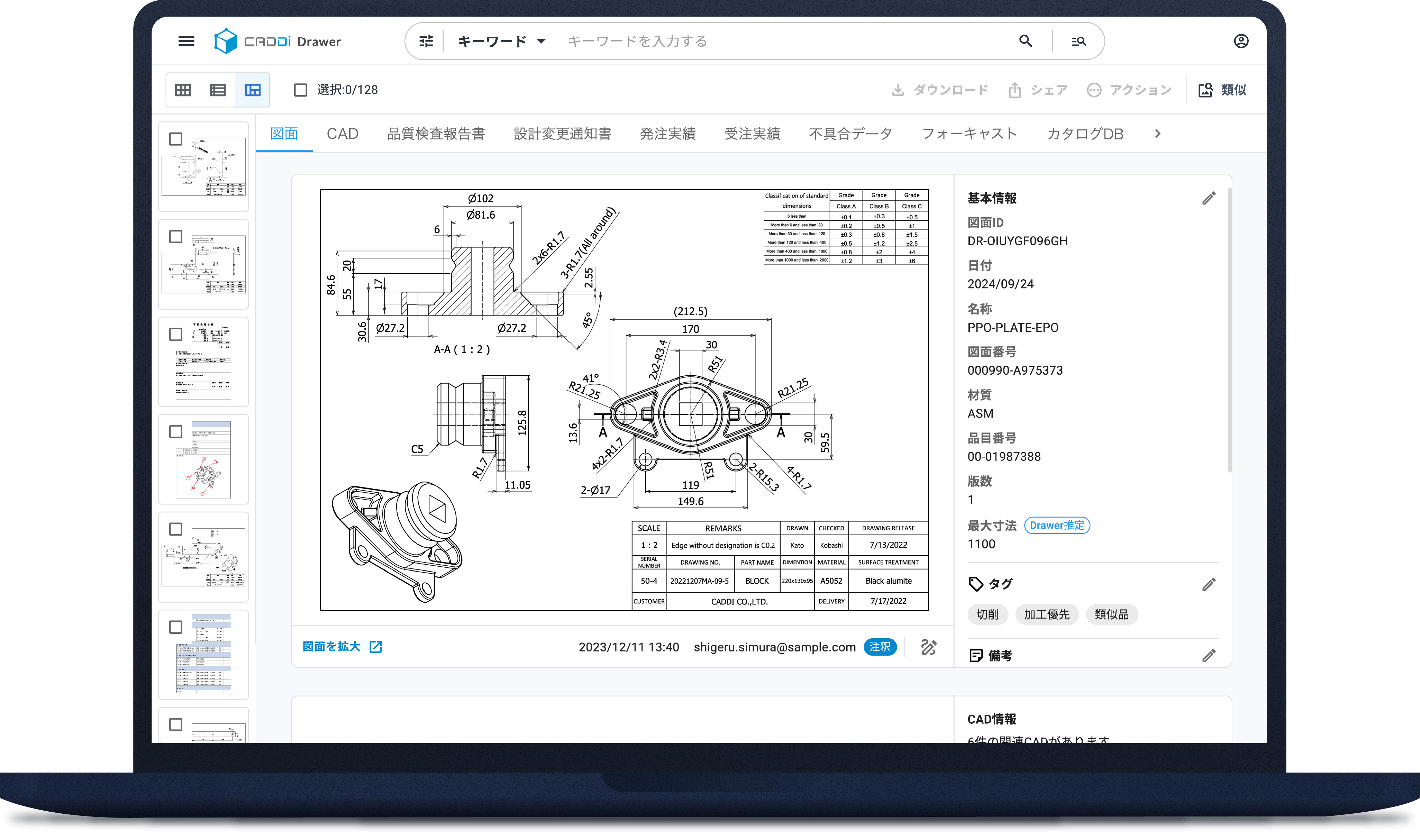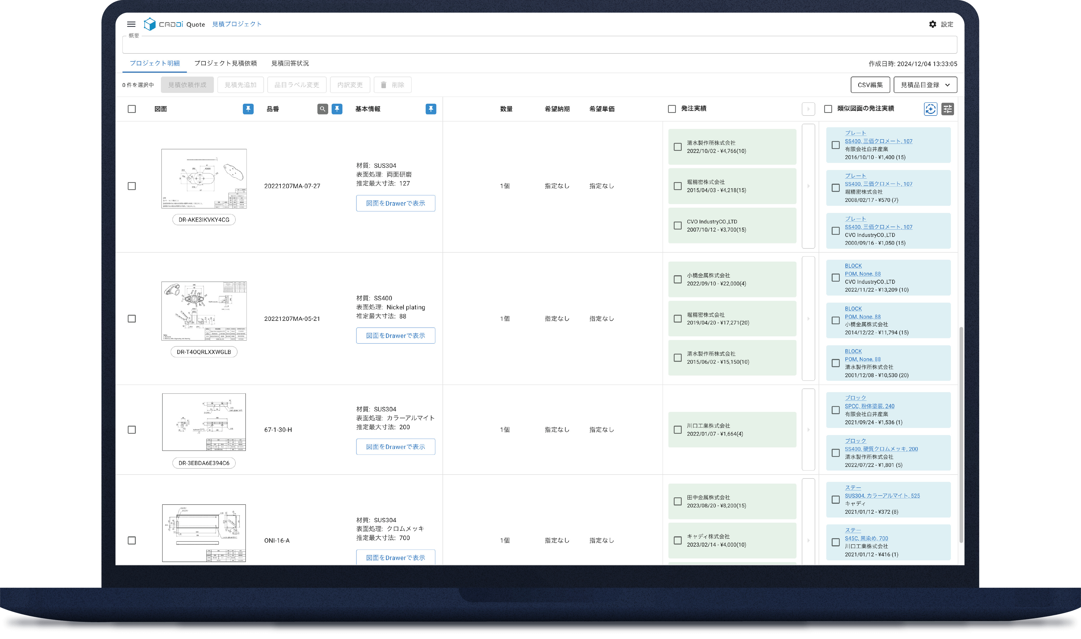 「製造業AIデータプラットフォームCADDi」は、製造業のエンジニアリングチェーン・サプライチェーン上のデータを解析・関連付け、インサイトを抽出することで、生産活動と意思決定を高度化するプロダクトです。祖業である部品調達事業での経験とAIを用いたテクノロジーの力を活用し、点在する経験とデータを資産に変え、競争力を高めます。