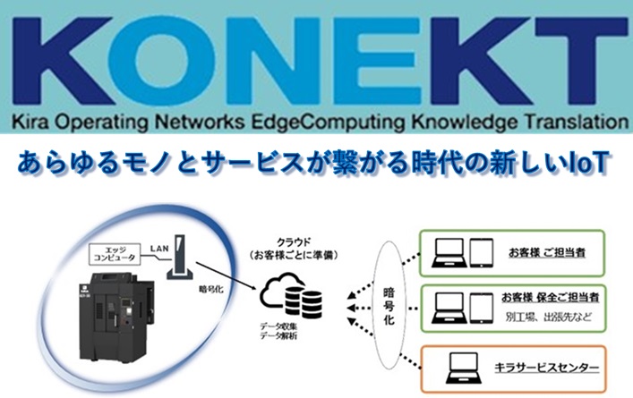 立形#40『PCV-40b』に高剛性主軸+1/4減速機仕様(OP)搭載して工程集約提案を行います。対象の加工物は『鋼材』を想定。ブローチング加工用ツールを取付けキー溝加工を実現、旋削加工においては2000回転まで対応可能です。お客様のご要望に十分満足できます。加工精度もワンチャッキングでの加工が可能な為、高精度が維持できます。 キラ開発のIoT KONEKTは生産状況の可視化だけではなく生産性向上に直接役立つIoTです。シンクライアントなIoTでスマートフォン、タブレット、PCで操作可能。及び遠隔での機械状態監視、CNC画面表示・操作など離れた場所から遠隔操作で対処が可能です。ブース内で1日/4回 実機を使用してKONEKT実演のプレゼンを行います。更に、脆性材加工機コーナーでは超音波ホルダーのご案内、サンプル加工品の展示を行います。是非弊社ブースにお越しください。