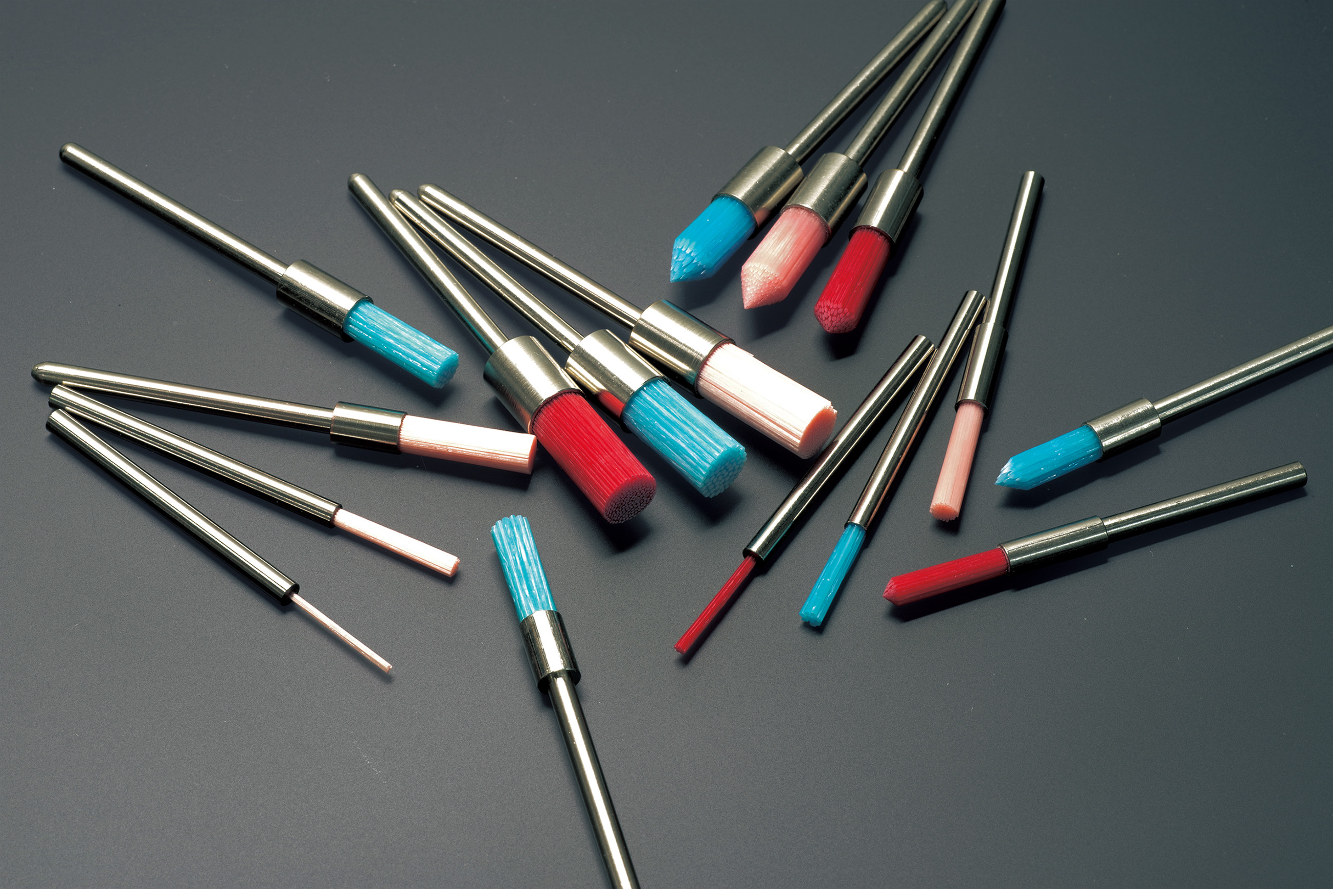 一般のブラシと異なり、回転時の毛先の広がりがほとんど無いため、狙った箇所をピンポイントで研削する事が可能なので、小径の交差穴の微細バリ取りに最適です。
