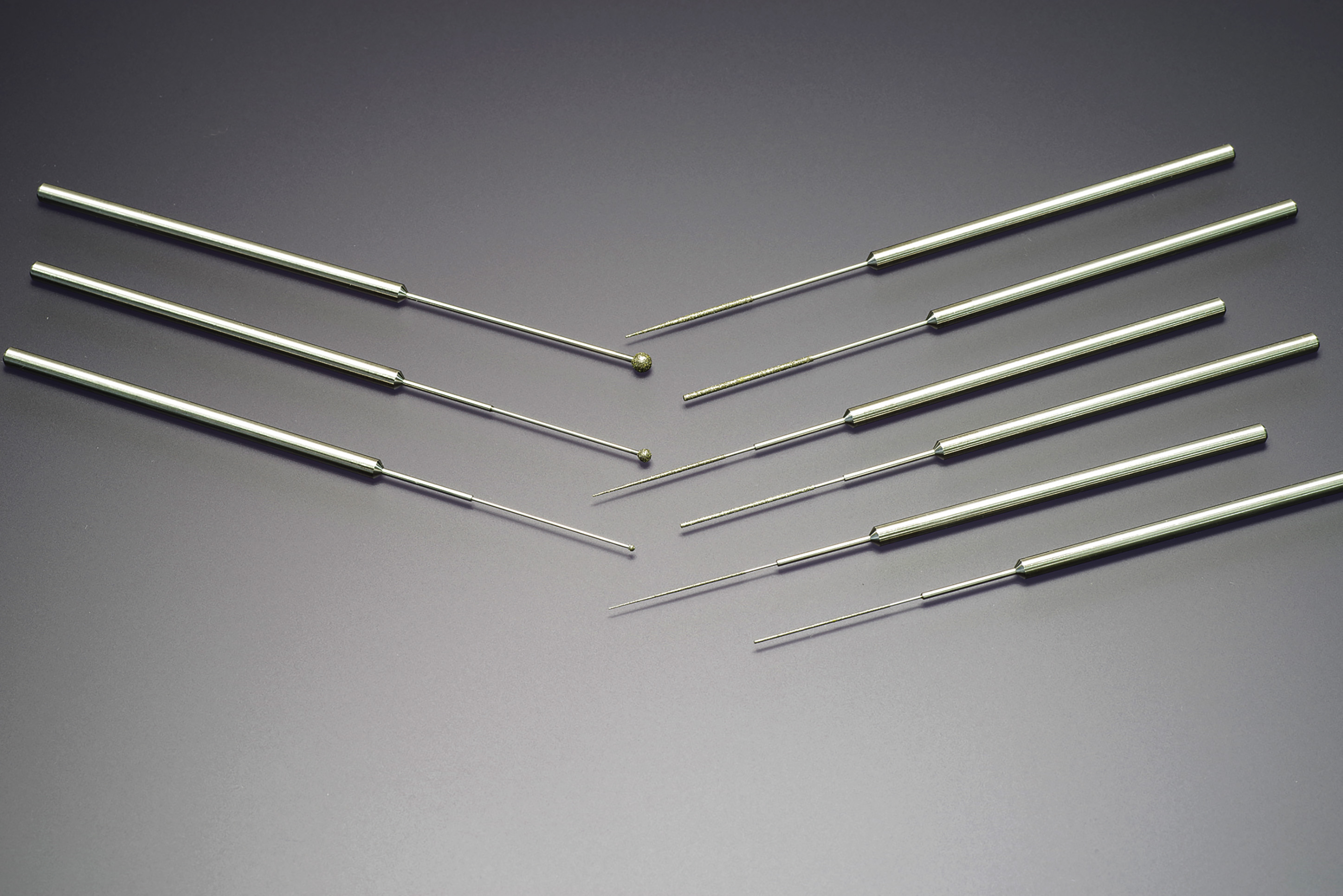 細く深い穴の中のバリを除去するのに適した電着ダイヤモンドバーです。 極限まで首下部分を細長くした形状は、加工ポイントの目視がしやすく、的確な研削が可能です。