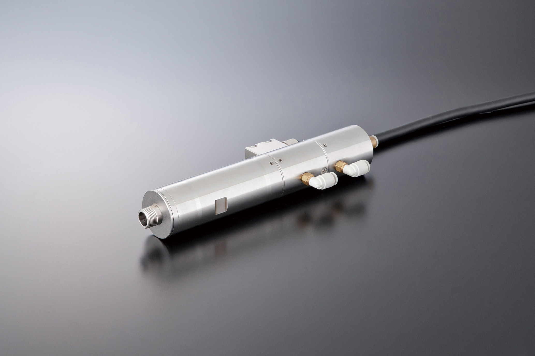 最大回転速度60,000min-1の高トルク・高剛性スピンドル 主軸部胴径 : ø45㎜ / 213.1㎜ 精度 : 1 μⅿ 最大出力 : 1,000 W / 0.16 N・ⅿ 質量 : 2.18 kg