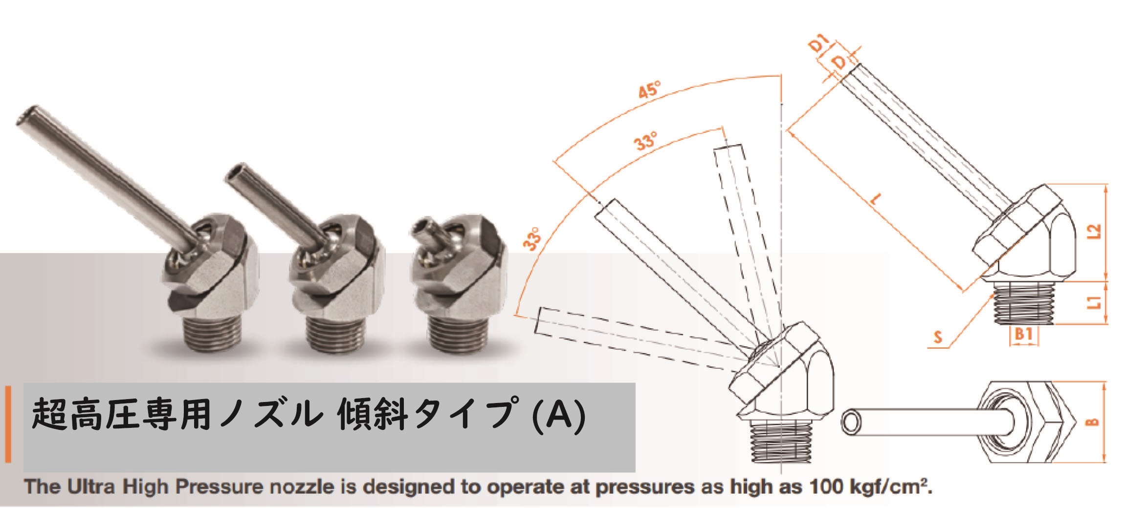 最大水圧100kgf/cmまで保証した超高圧専用ノズル(ステンレス製) 高圧でクーラントを噴射することにより冷却効果や切子除去能力の向上が図れます。