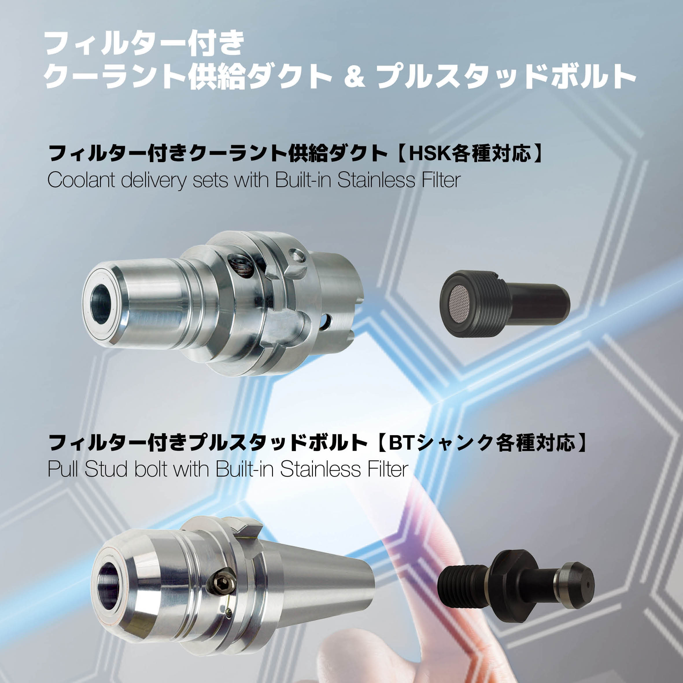 フィルター付きクーラント供給ダクト&プルスタッドボルトは、切屑トラブルを未然に防止可能。100µmステンレス製フィルターにより、ホルダーへの切り屑流入をシャットアウト。