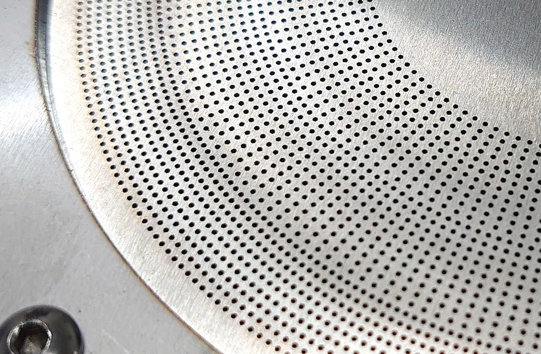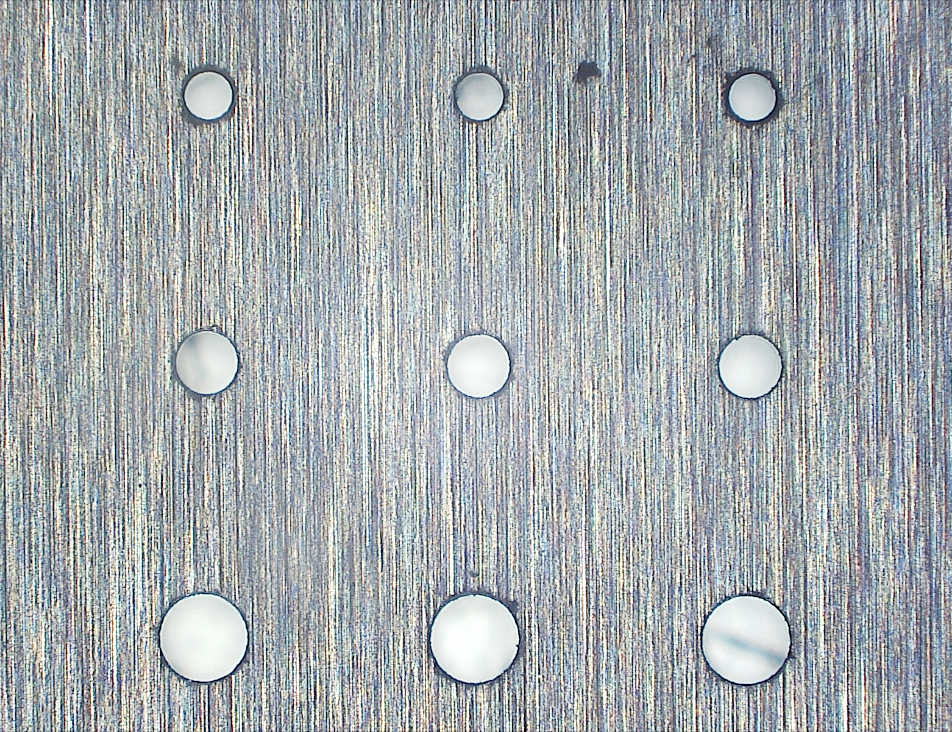 公差±0.01の高精密加工 <加工データ 材質|SUS303 厚み|1.0mm 穴径|φ0.32 公差±0.01 加工速度|8秒 ※1穴あたり>