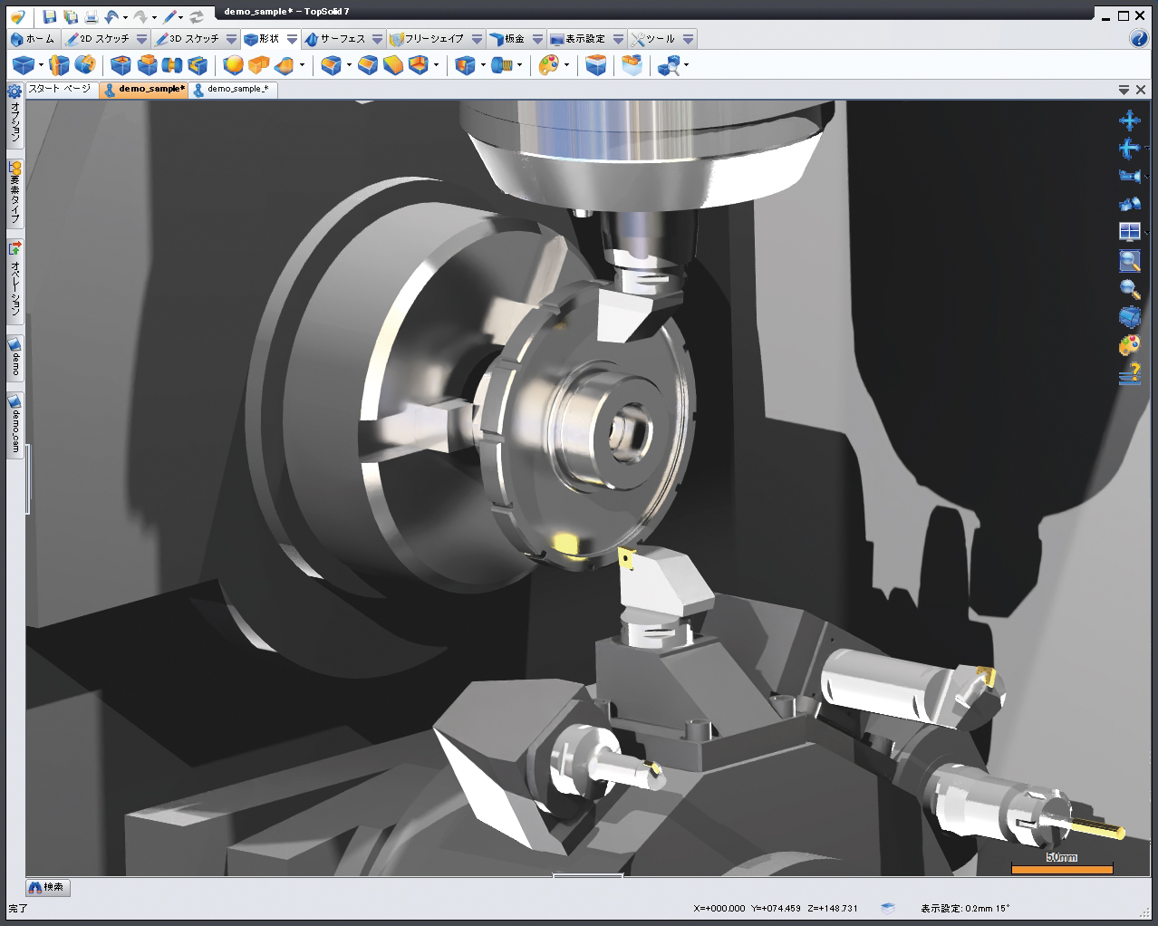 ドリルや溝加工など多様な切削・複合加工に対応。同期制御や極座標変換、工程最適化、干渉確認、CAD連携、ポストプロセッサで高精度かつ効率的な加工を実現します。