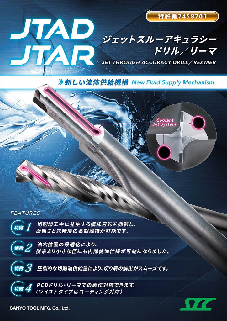 独自技術で進化を遂げた「ジェットスルードリル」はクーラントを効率よく排出しながら高精度な穴加工を実現、工具寿命や加工安定性の向上に貢献します。PCD付はφ2.75から製作可能です。現在PCDジェットスルードリルの標準品化も進めていますのでご期待ください。