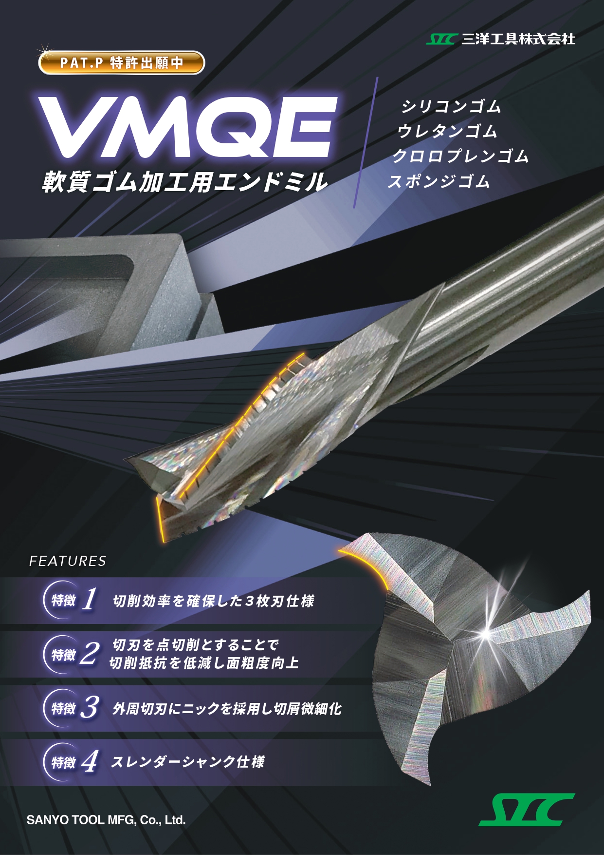 2025年5月に発売した「VMQE」は軟質ゴムの加工に特化した超硬エンドミル。独自の刃型設計により柔らかく加工が難しい軟質ゴム素材に対応しており高寿命かつ安定した切削を実現します。