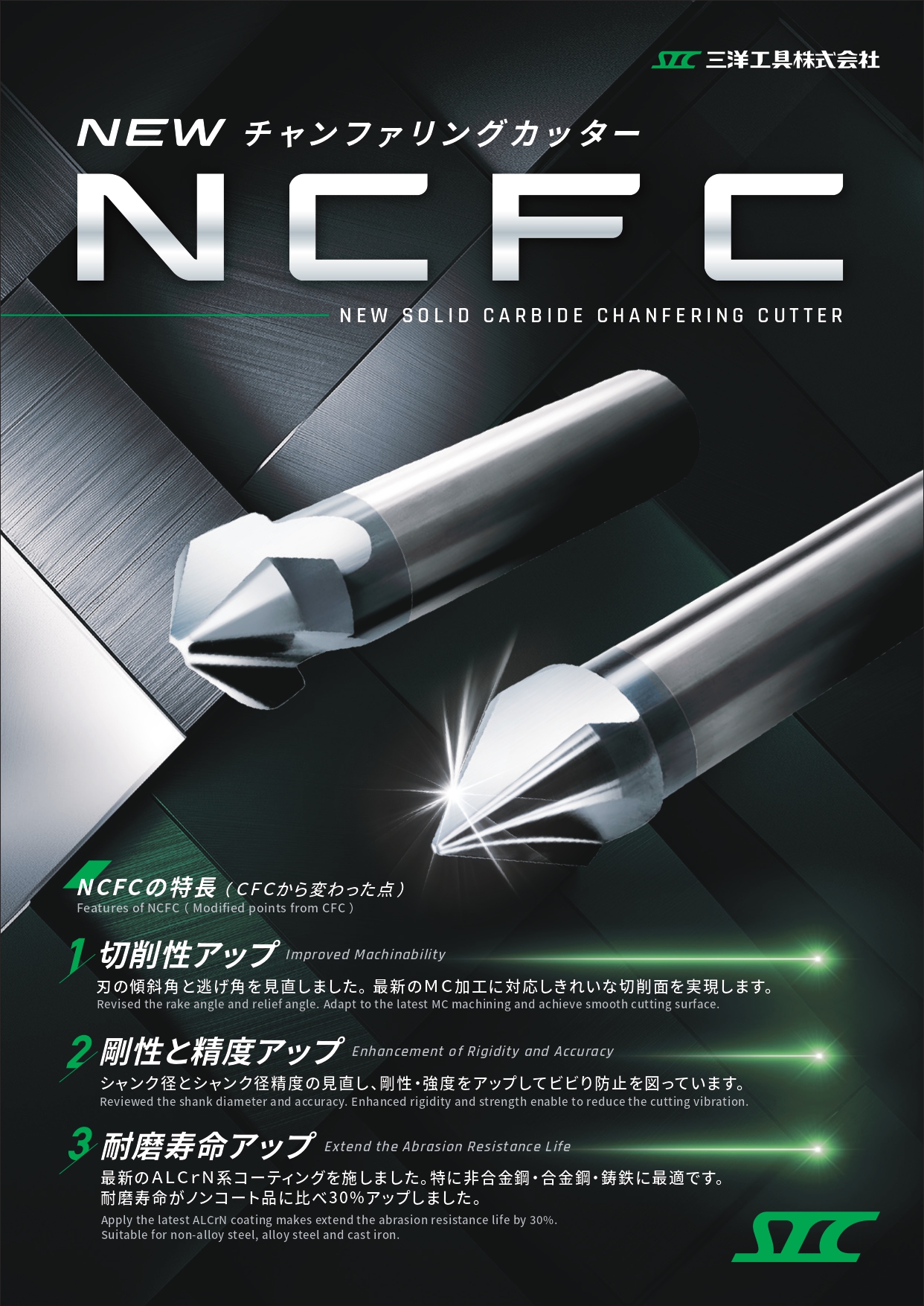 新設計の面取りカッター「NCFC」は適切な逃げ角の円弧逃げとスクイの着いた捩れ刃で切削性をアップ、美しい仕上がりと高能率加工を両立します。