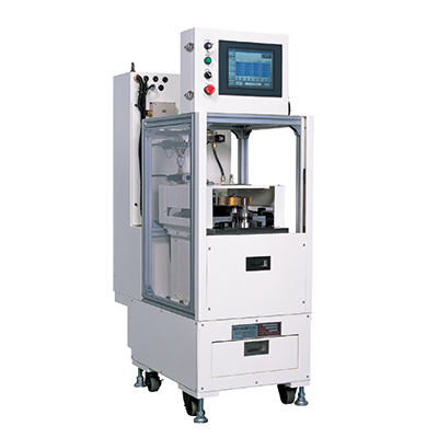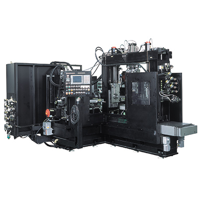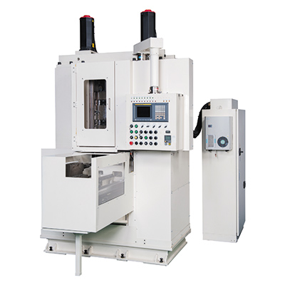 左右2つの主軸にて2面の同時加工を行います 機内にて加工品を90°自動回転させ再度2面を加工することで 4面の1サイクル加工が可能です