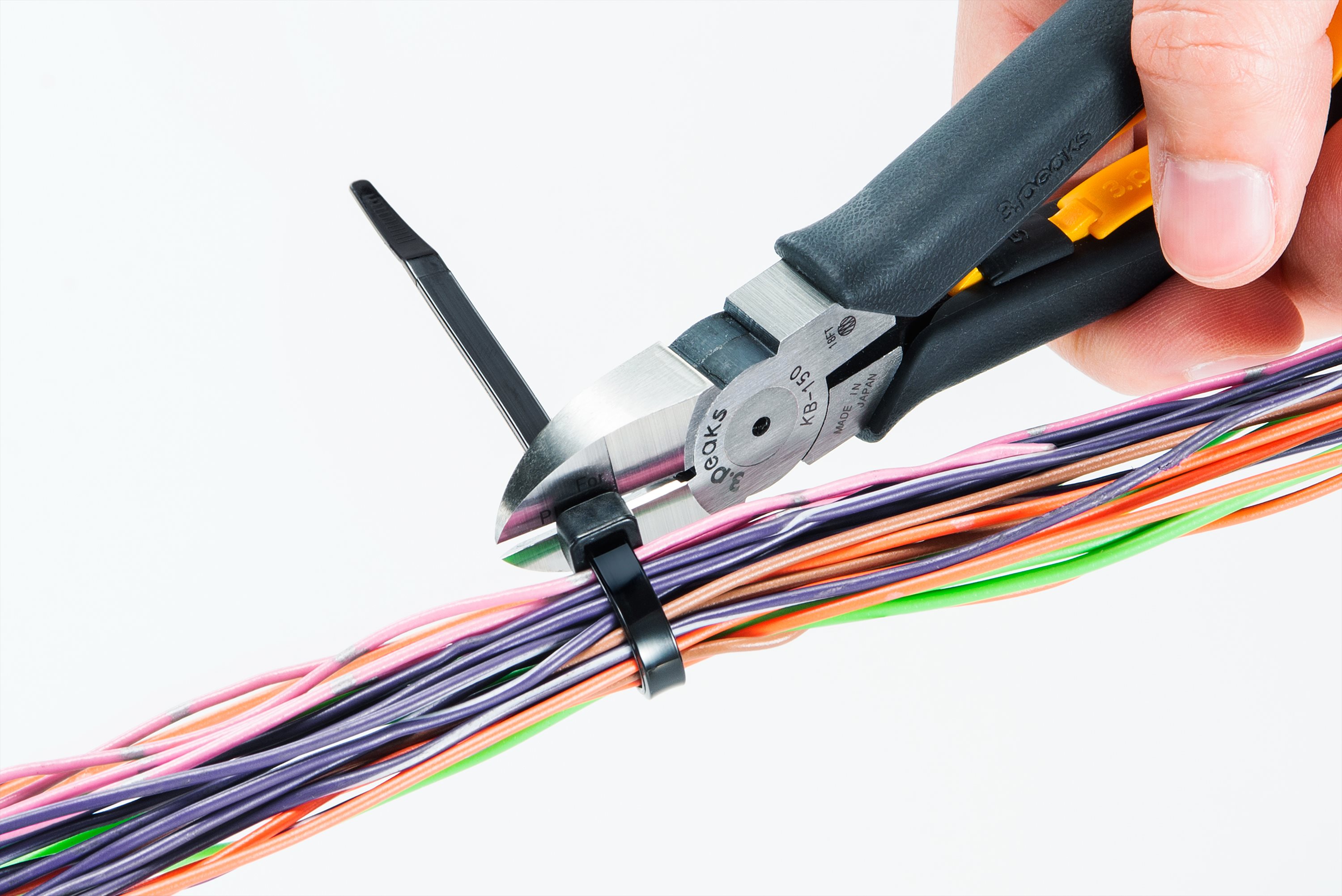 結束バンドをつかむ、ひっぱる、切るが1丁で完結できます。刃面はフラットで、切断面が美しく仕上がります。銅線の切断も可能です。連続作業が楽なコイルバネ付(脱着可)。