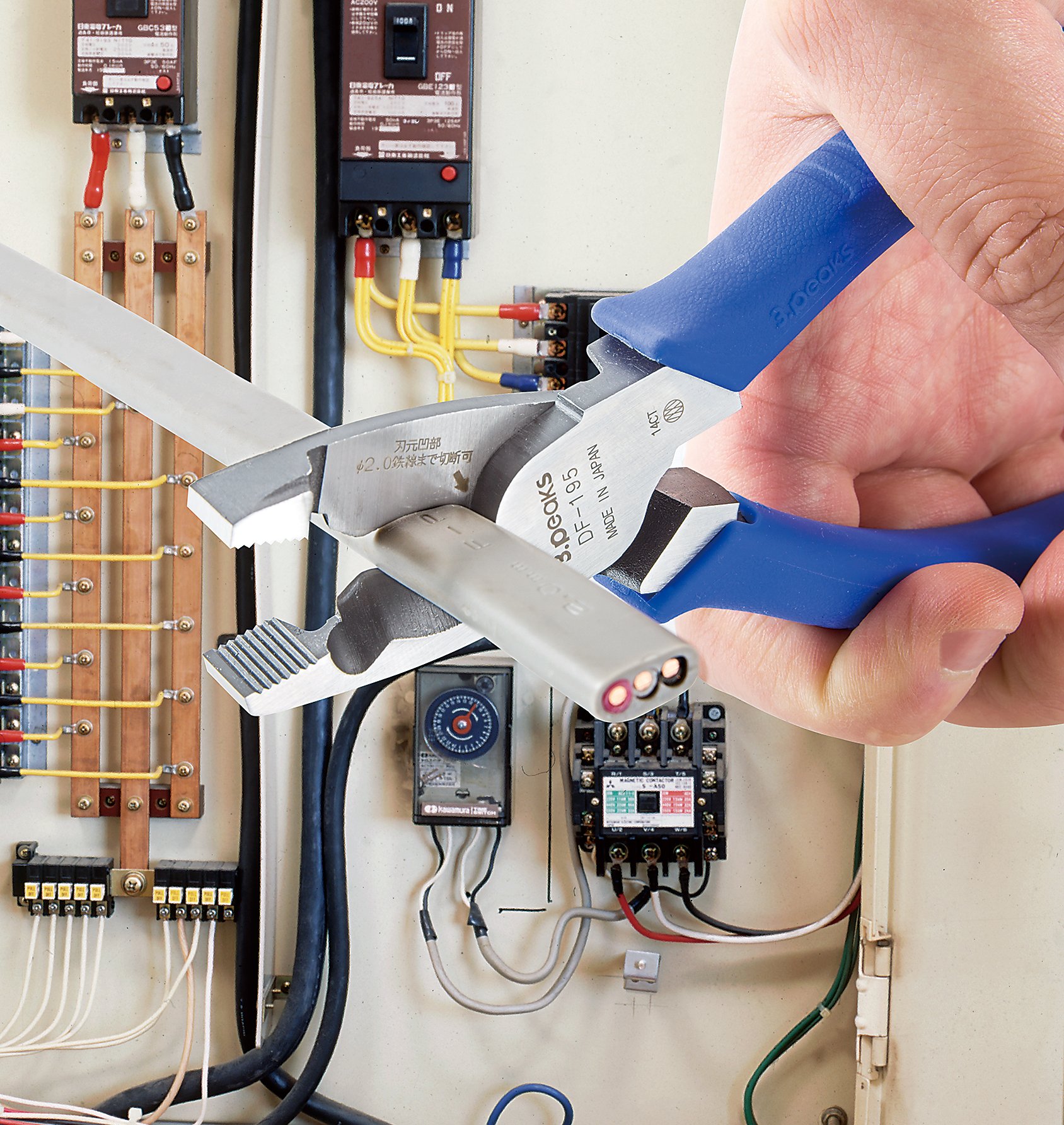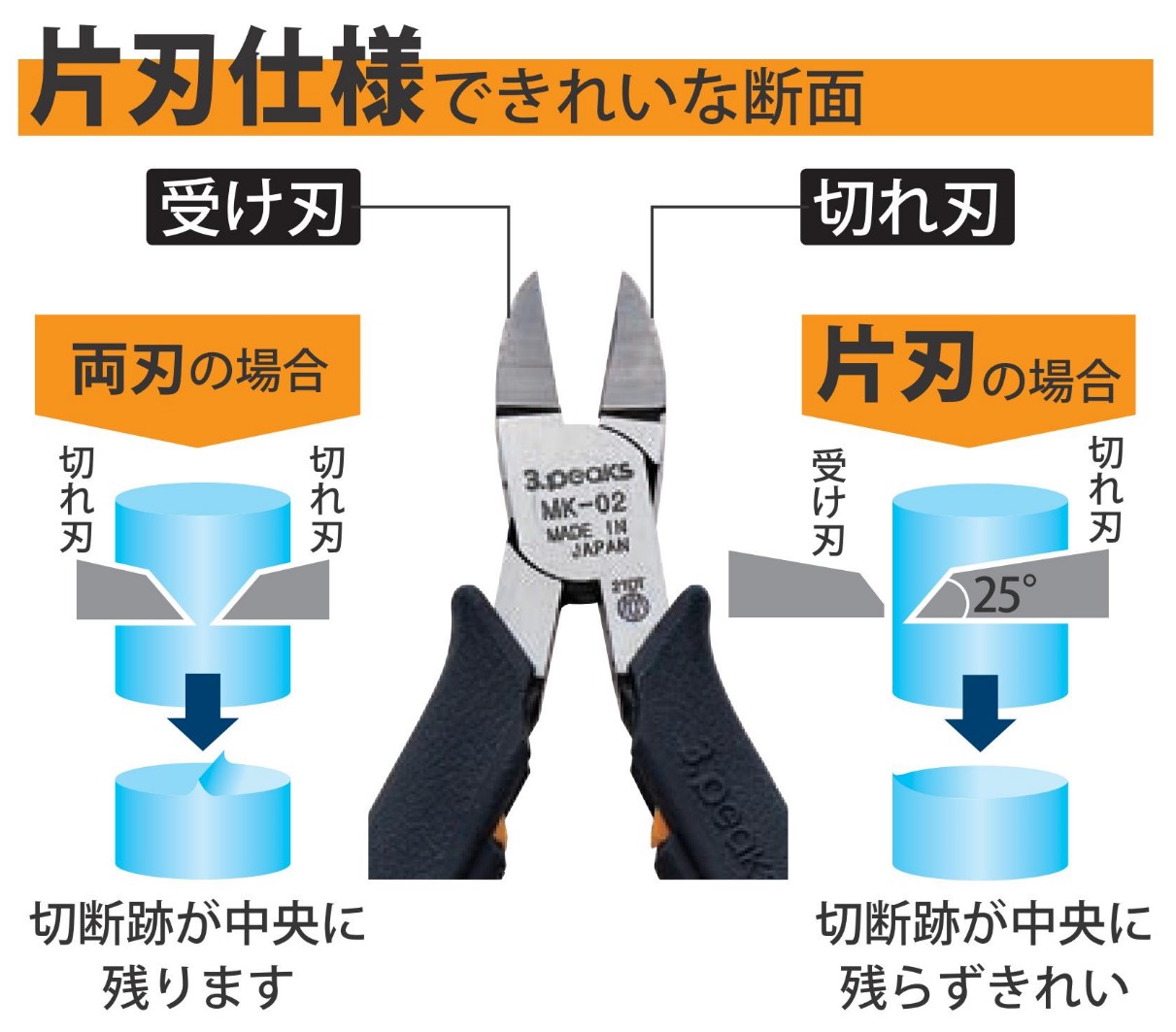 刃に2種類の厚みを付けた新発想のニッパです。薄い刃先で結束バンドや配線を美しい切断。厚い刃元で金属線を強力に切断と、用途によって使い分けられます。