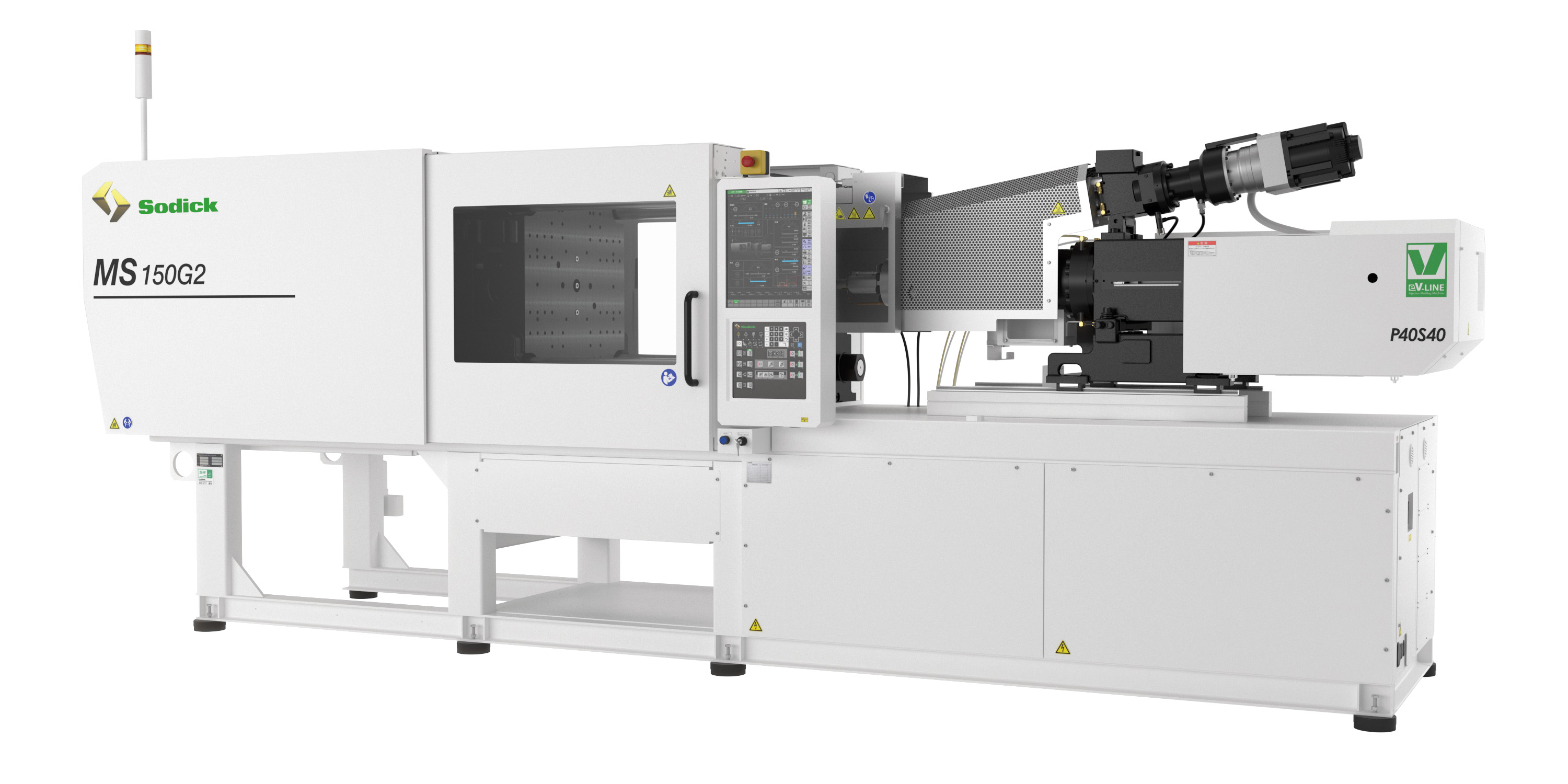 電動式射出成形機「MS150G2」では、eV-LINEと新型締機構による精密・安定成形を実現しつつ、各装置の電動化で消費電力を削減します。