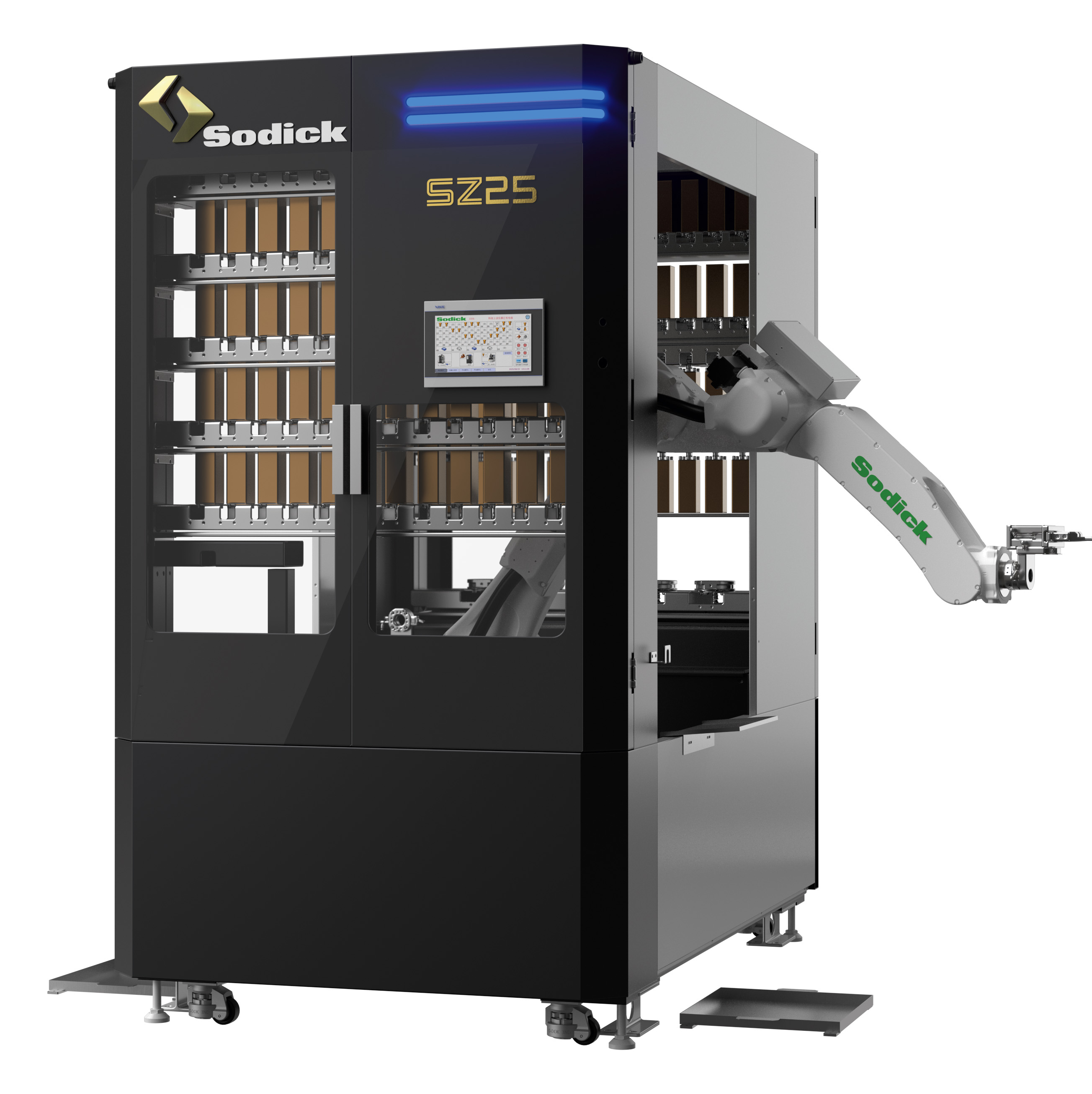 初出展のマシニングセンタ「GS540L」と形彫り放電加工機「AL40G+」は、ワーク・電極交換用ロボットと接続し、スケジューラによる自動運転を行います。