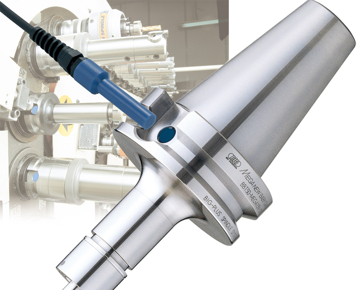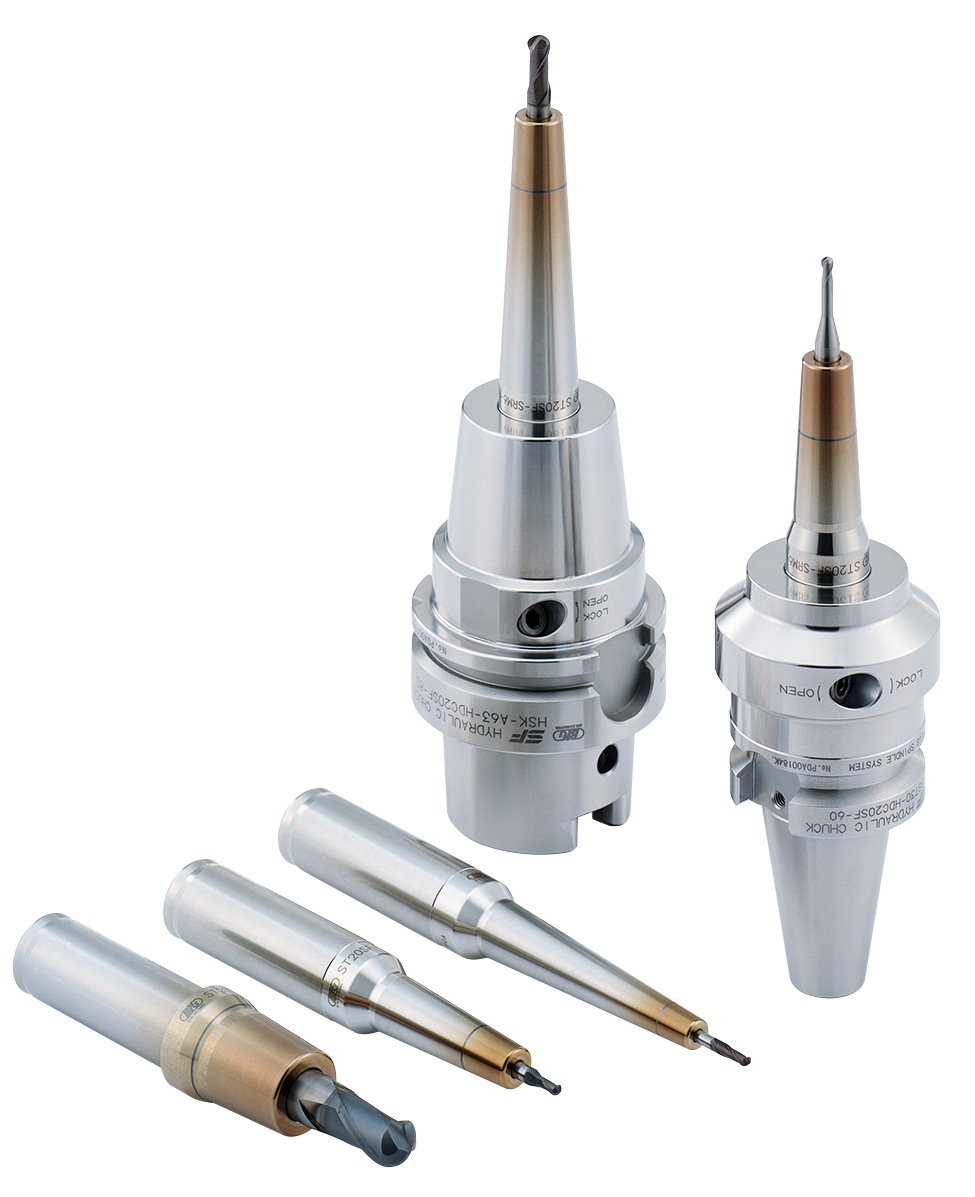 焼きばめ方式の「SFスリーブ」を、繰り返し振れ精にの優れたハイドロチャックでクランプ。金型・5軸加工における、ワークや治具干渉、加工に応じたツールレイアウトが選択できる。