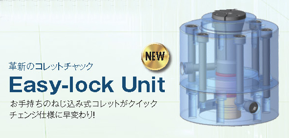 コレットチャックの段取り交換をスピーディに行える機構です。 会場で体験できます。