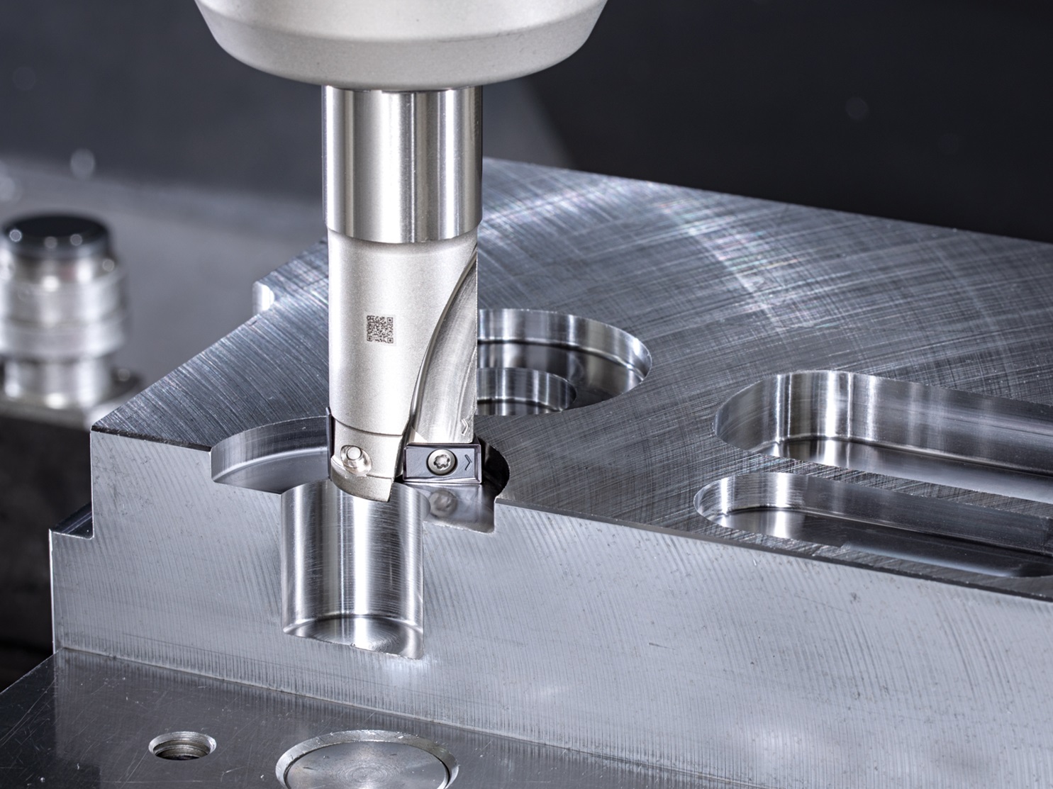 穴あけから肩削り、掘込み加工まで対応する中心刃付き多機能カッタ 中心刃と外周刃の両方に使用できる両面仕様インサートを採用 穴底がほぼフラットでボルト座の座繰り加工等にも最適