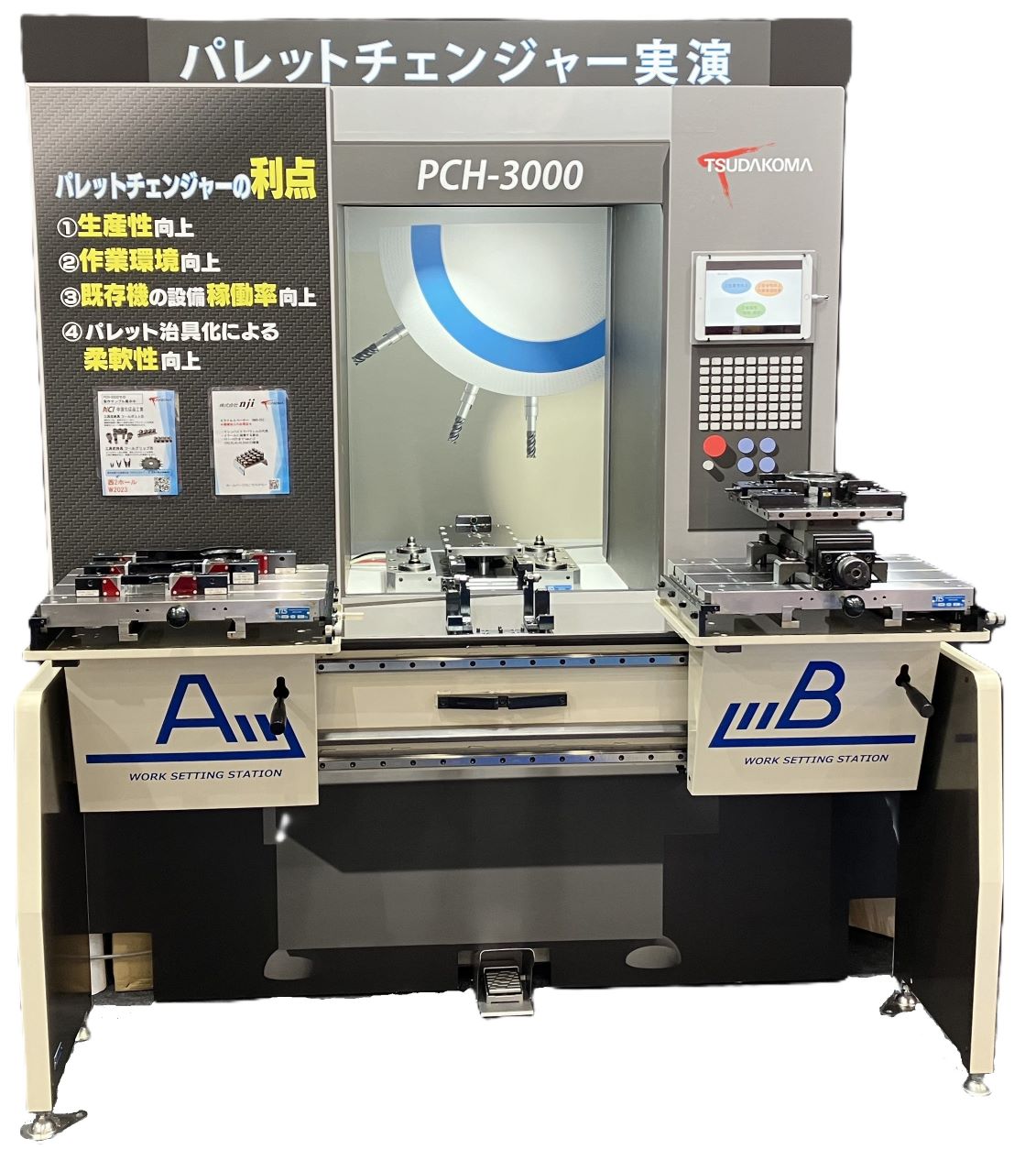 さらに、最大ワーク旋回径φ800の「NC傾斜円テーブル メガワーク加工モデル」(参考出展)や、マシニングセンタに後付可能で、既存設備の生産性の向上が可能なパレットチェンジャーの「PCH-3000」、自動化対応の「AWC装置」(参考出展)を実機展示いたしますので、その場で直接工程集約や省人化に貢献するソリューションを体感できます。