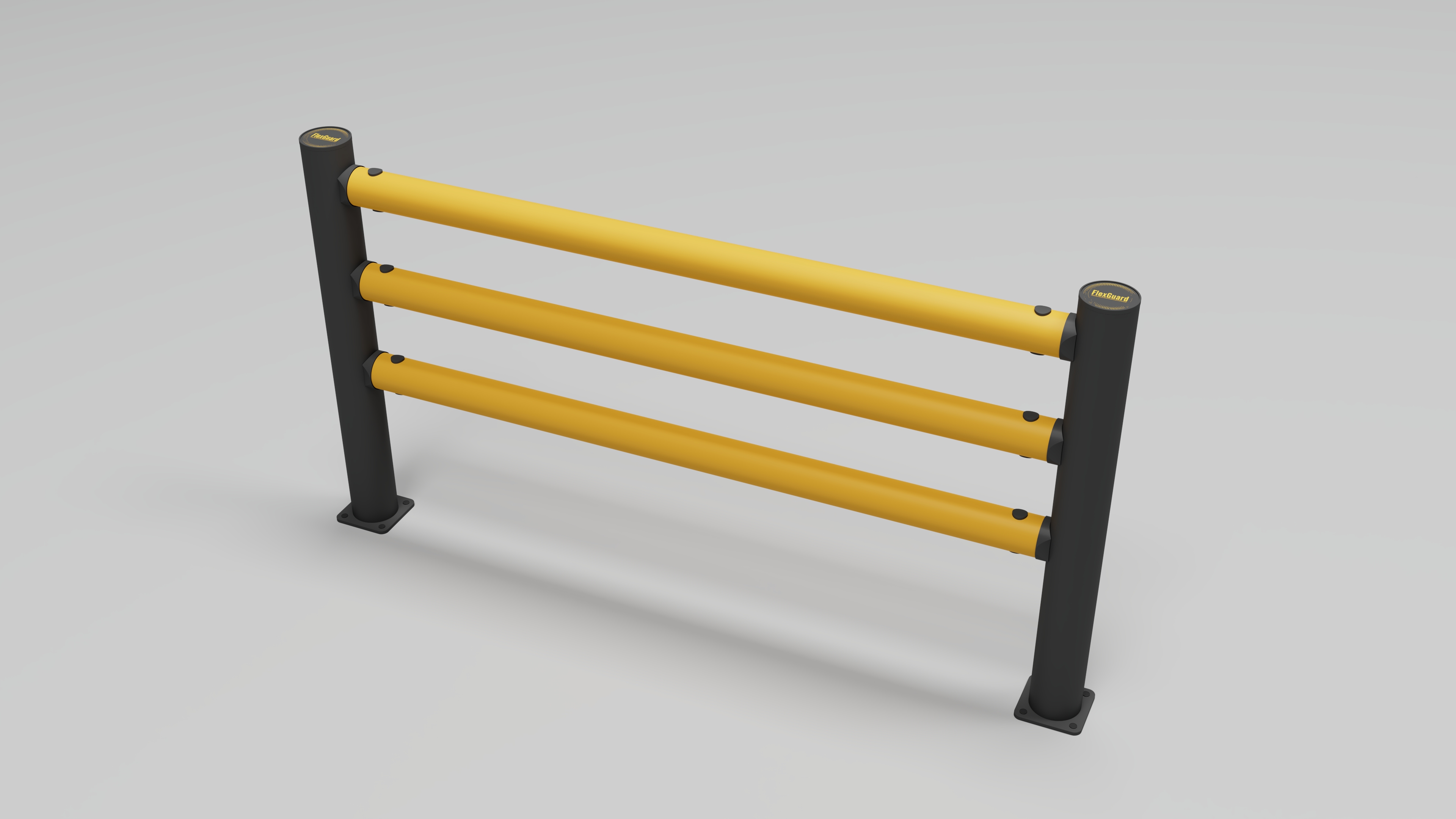 機械・作業車両が行き交う環境において安全を確保する「Flex Guard」 衝撃エネルギーを吸収するポリマー製の為、本体や車両にダメージを与えません。