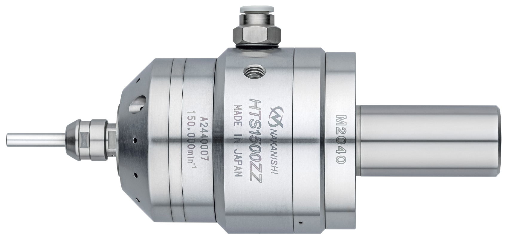 Max.150,000min⁻¹のマシニングセンタ用タービンスピンドル。周速が必要なR0.5mm以下のボールエンドミル加工にて抜群の性能を発揮。Z変位が1分で安定。