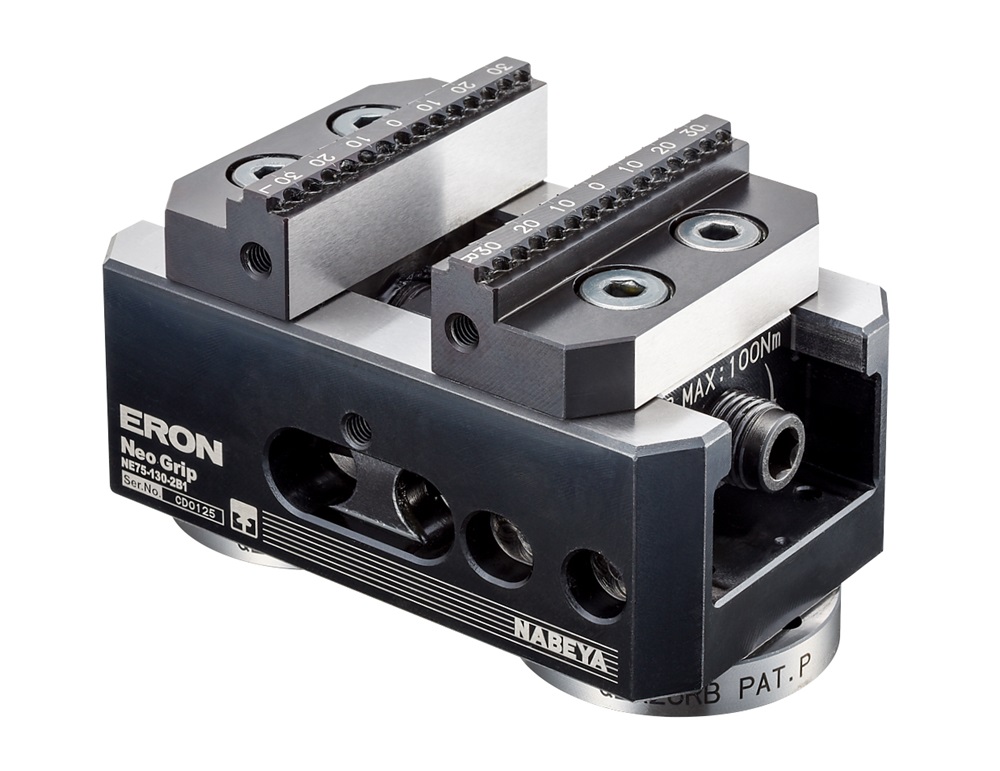 5軸マシニングセンタに対応したセンタリングバイス。 掴み代3mm、センターで平行に強力クランプでき、ワンチャッキングで5面加工を実現。 口金の組換えで口開きの増大化が可能