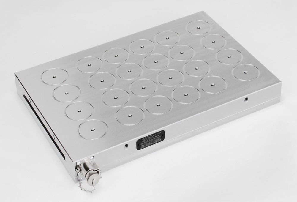 磁力で吸着固定するチャック。 鉄系ワークをワンチャッキングで5面加工。 引込力6150N/磁極φ70の強力クランプで大型サイズも対応。 加工時はケーブルの切離しが可能。