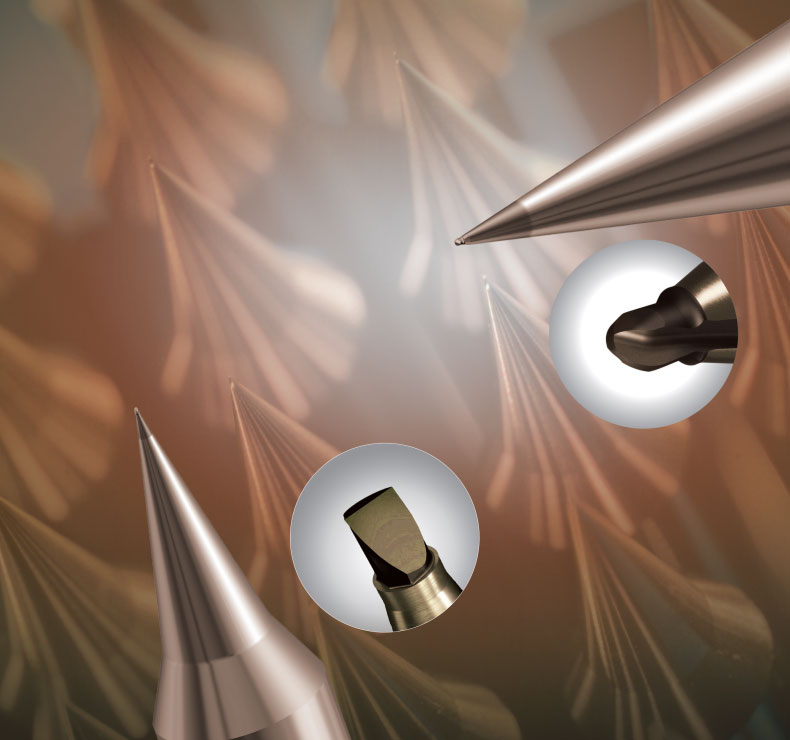 日進工具の大きな強みである小径サイズのエンドミルの中でも、外径Φ0.01~Φ0.1のエンドミルを標準化した超微細な精密切削加工を可能にする製品です。