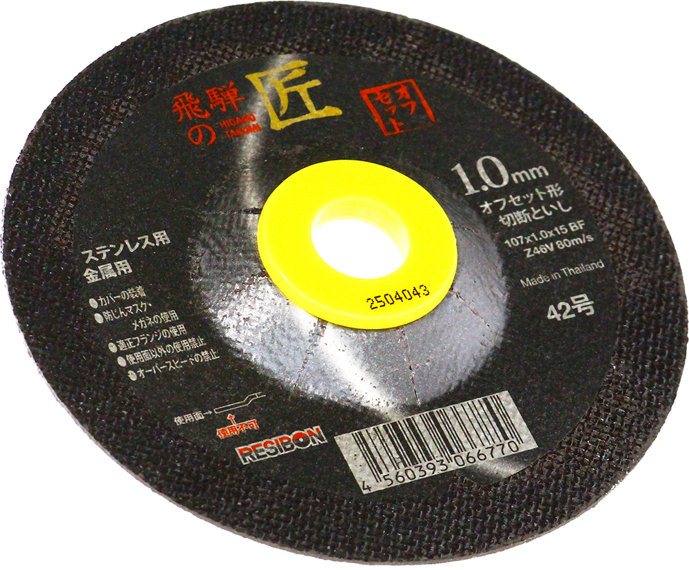 オフセット形切断砥石。オフセット形状によりキワ切りが可能であることに加え、コシが強く曲がりにくいため、真っ直ぐ切ることもできる。高切断力と高寿命で使用者の作業を効率化。