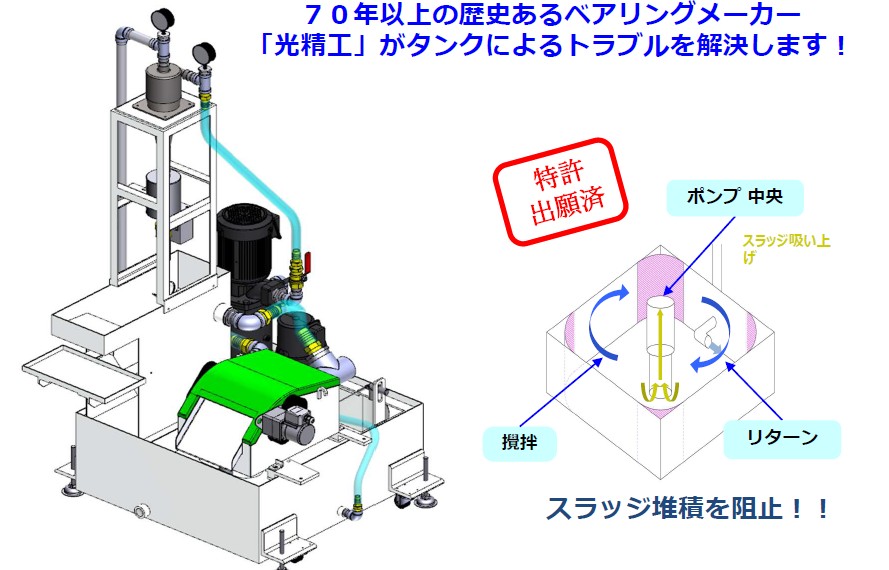 研削工程で悩まされるクーラントタンクの スラッジ堆積による腐敗臭、定期清掃のわずらわしさ、 などの問題を研削屋の光精工が解決。