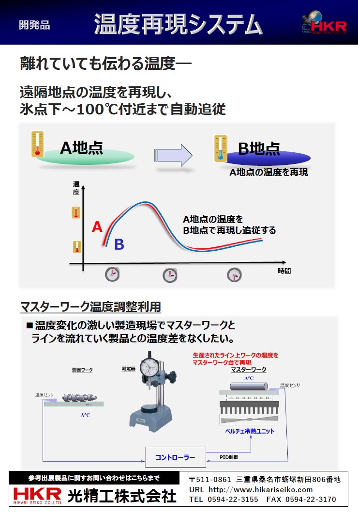 ペルチェモジュールを用いて、ある場所の温度を装置上で再現できる装置です。 適用例 冬場の現場で冷えて寸法変化したマスターワークを 加工液の温度と同期することで不良数を低減。