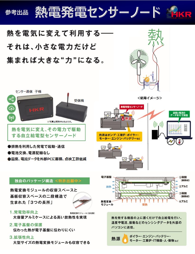 ポンプ、モーター、工業炉からの排熱を電気に変換し、 周囲の機器などの温度や電流情報を 外部PCに送信できるシステムです。