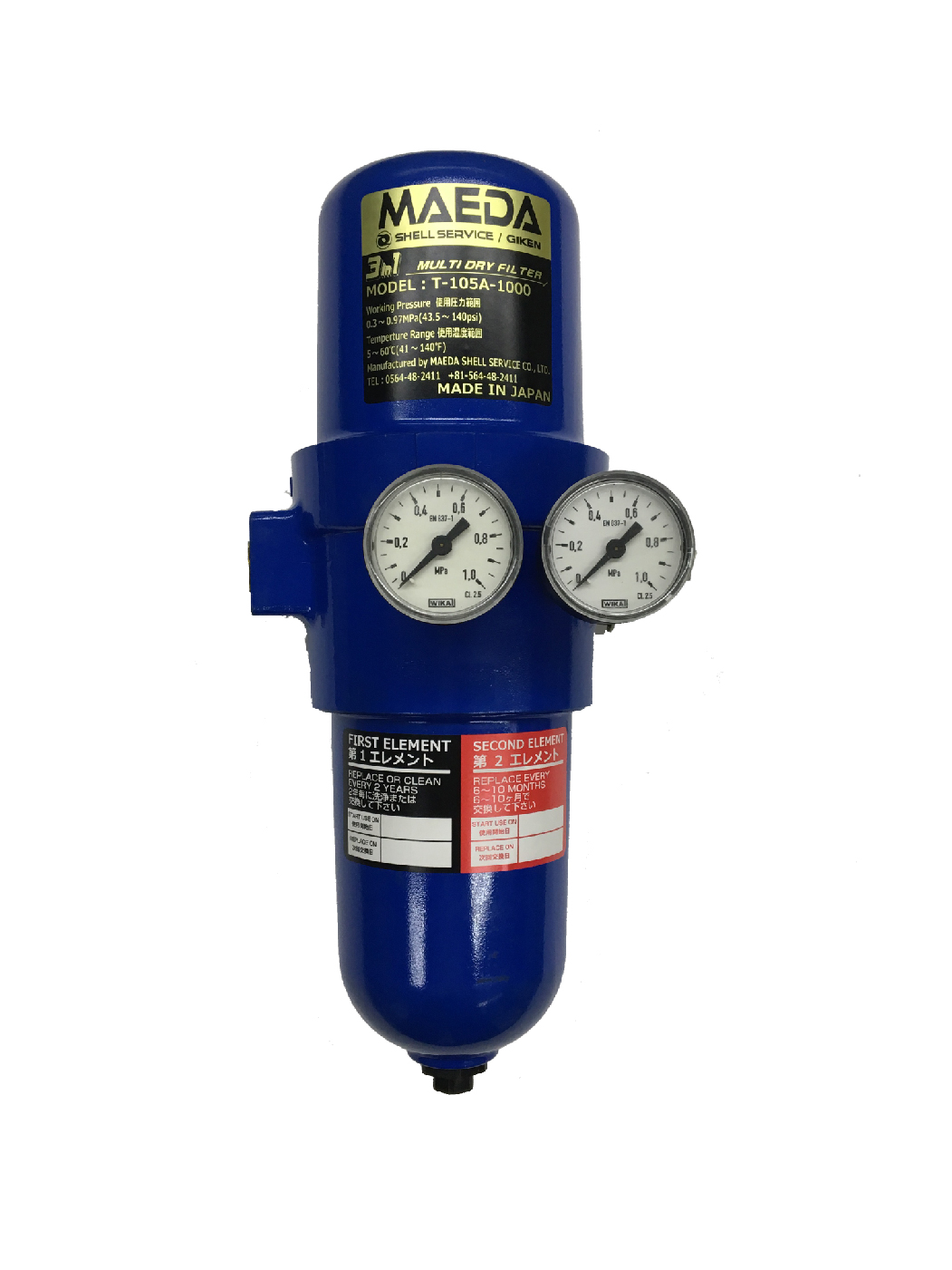 同軸上に3種類の特殊エレメントを内蔵した、工作機械・測定器等に最適な高性能圧縮空気用フィルター