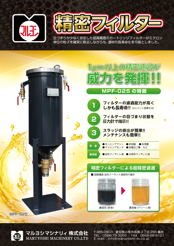 超精密ろ過フィルター(MPF-025)ミクロン単位の除去をしながらも濾材の長寿命化を可能にしました。カートリッジは1μm,3μm,5μm,10μmと種類も豊富です。