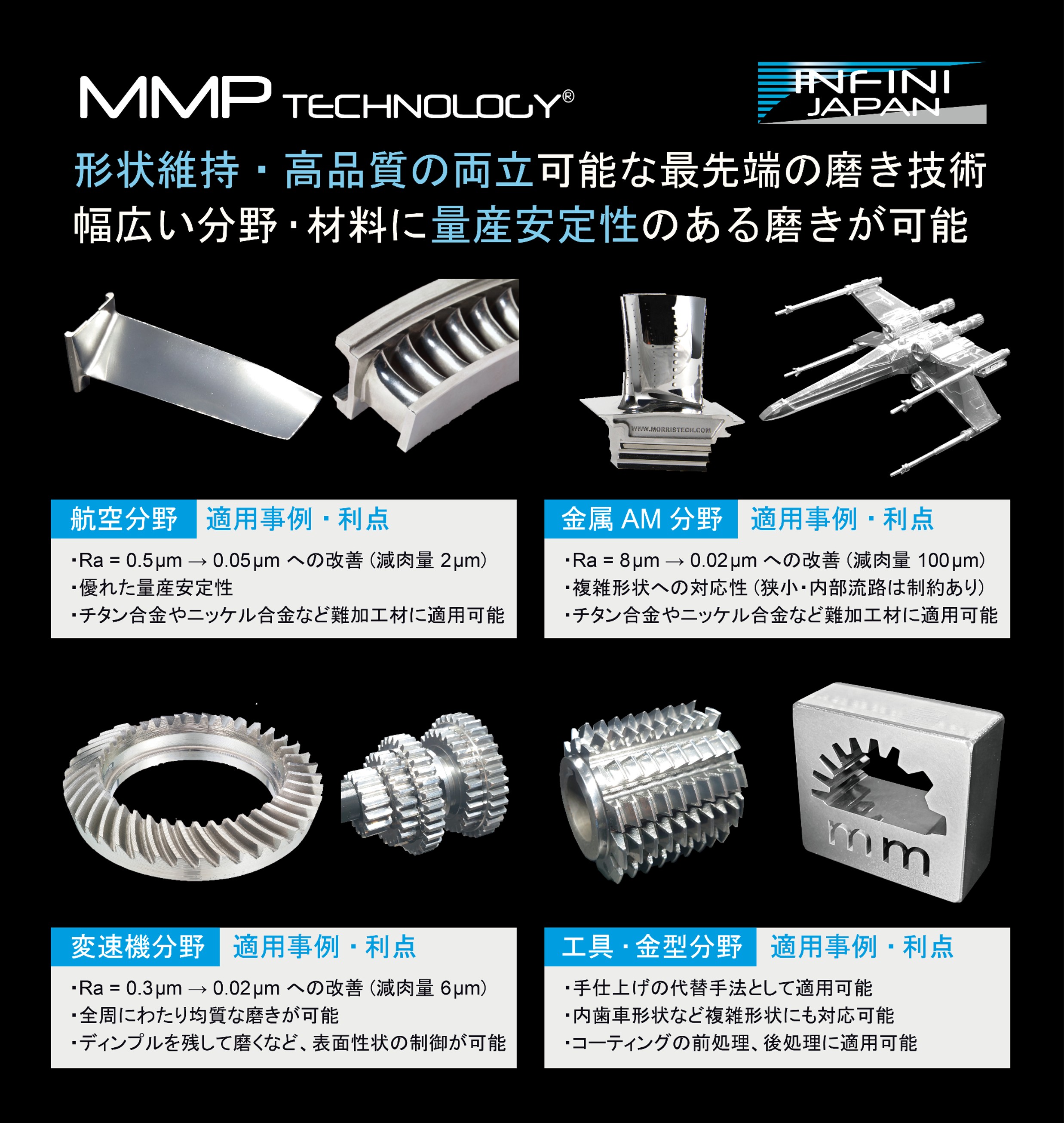 インフィニジャパン株式会社は、スイスのBinC Industries社で開発された表面仕上げ技術「MMP Technology®」の受託加工メーカーです。