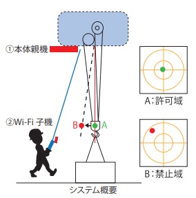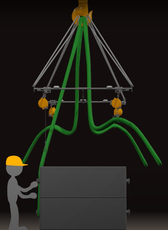 大きな金型に玉掛をする際、位置調整することなく簡単かつ安全に玉掛することができる。また玉掛が出来ていない箇所があると、巻上を停止する事で安全を確保する。